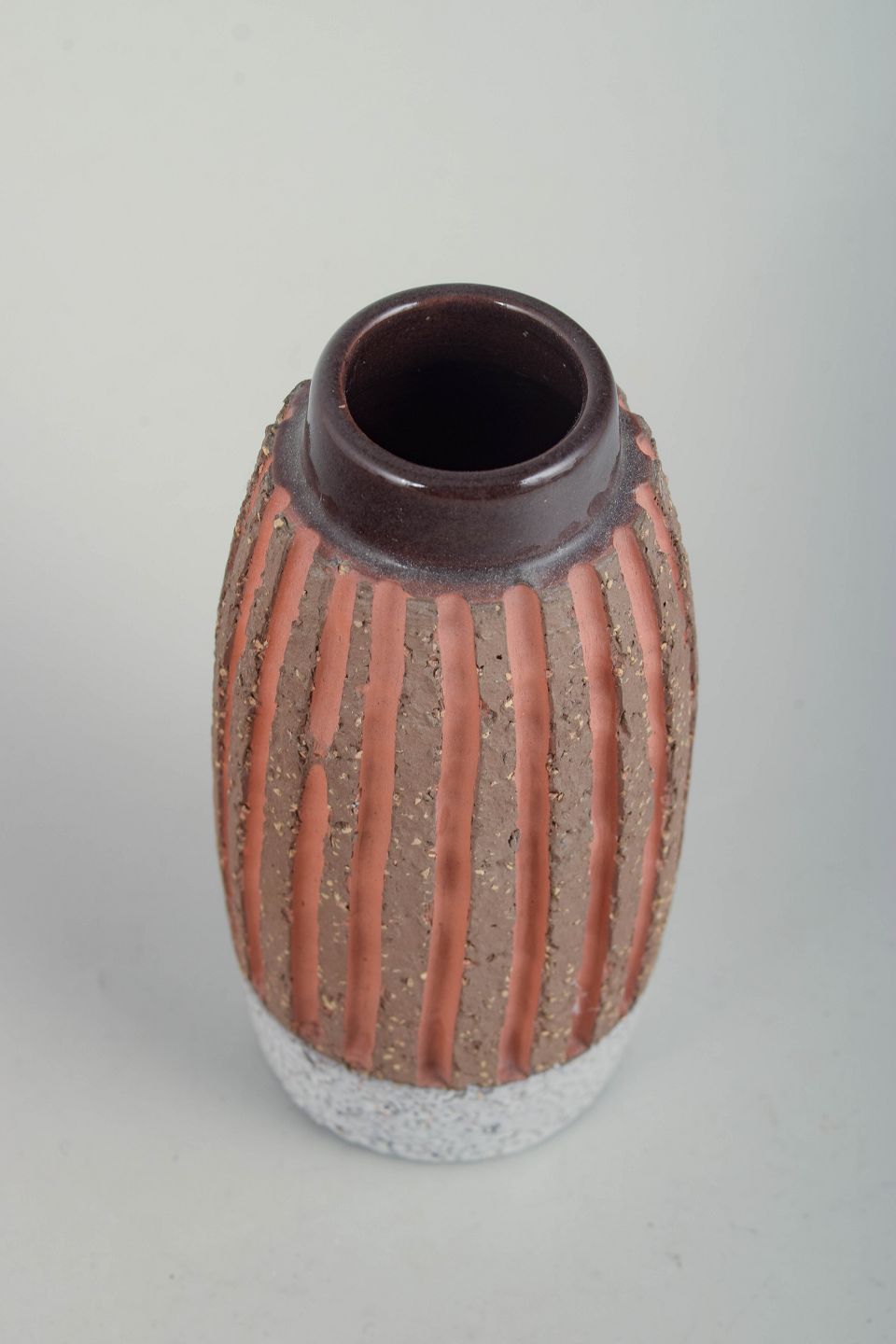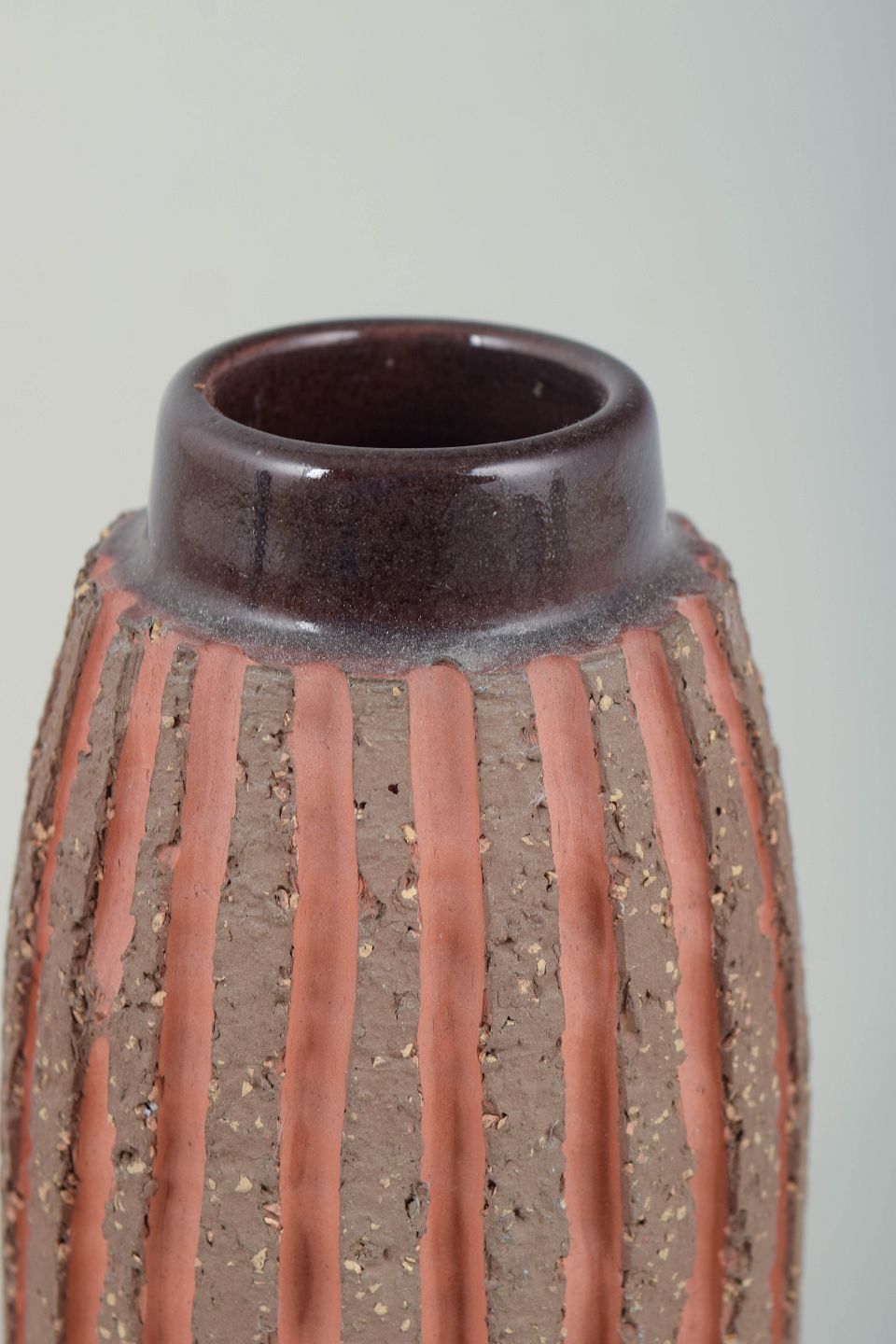 Small cylindrical glazed ceramic vase with a slightly narrowed neck. The body is decorated with vertical relief-applied stripes in terracotta tones against a darker, lightly speckled ground glaze, finished with a light, coarsely textured base. The decoration creates a strong tactile and modernist expression. Model number 4594.