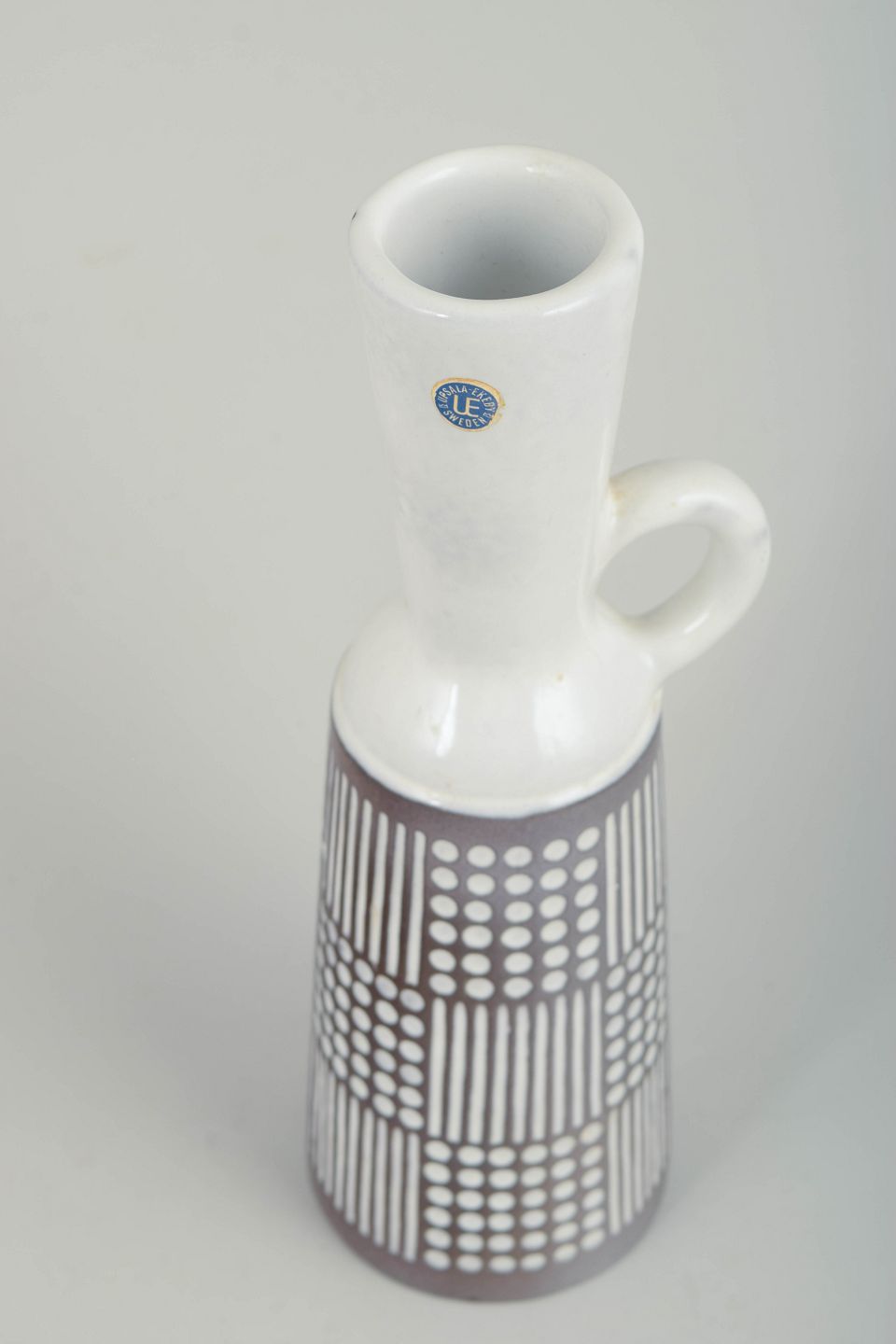 Tall, slender glazed ceramic pitcher with a narrow neck and single handle. The lower section is decorated with a strict graphic pattern of dots and vertical lines in white against a brown ground glaze, while the upper section is finished in white glaze. The rhythmic decoration gives the piece a clear modernist character. Model number 4564.
