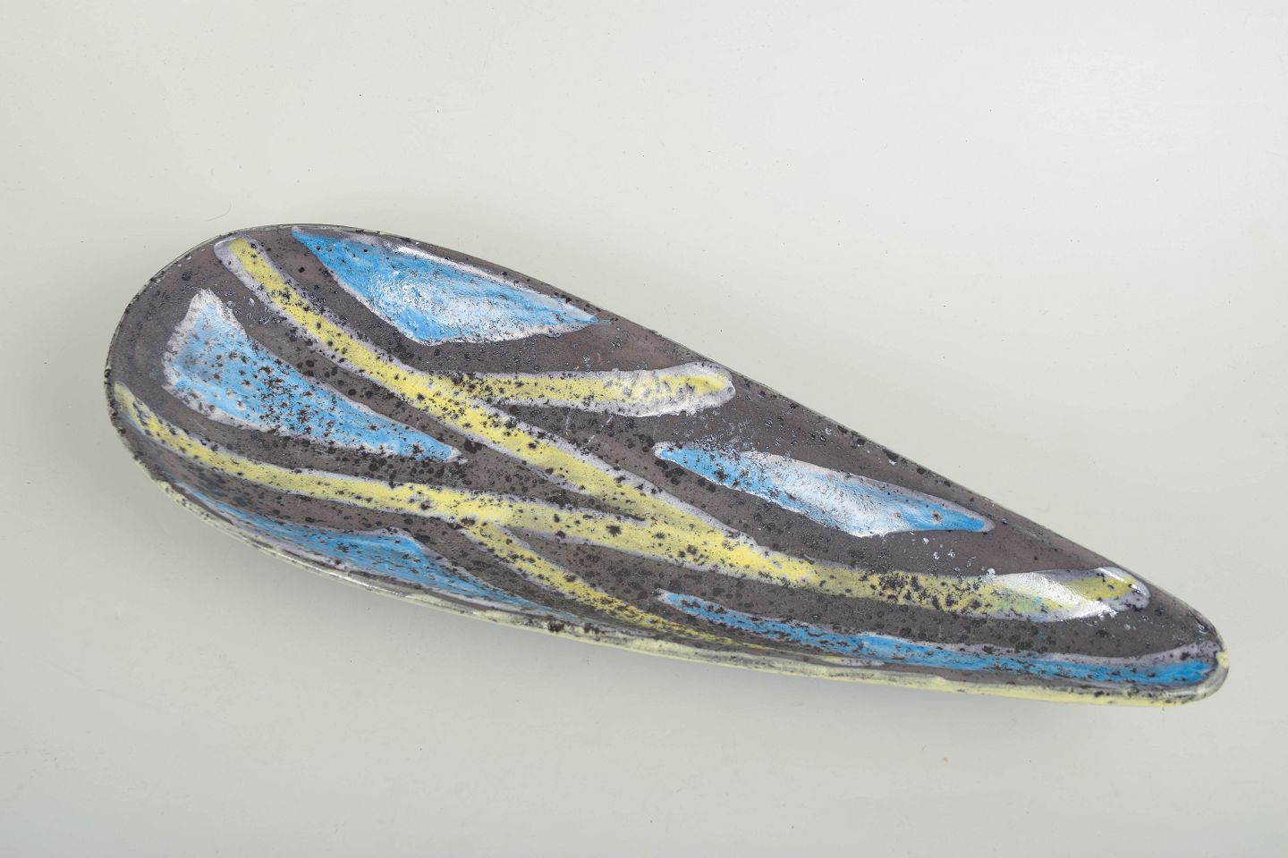 Large, organically shaped oval bowl in glazed ceramic with an abstract, hand-decorated pattern in blue, yellow and dark tones, featuring a characteristic speckled/splashed glaze effect.