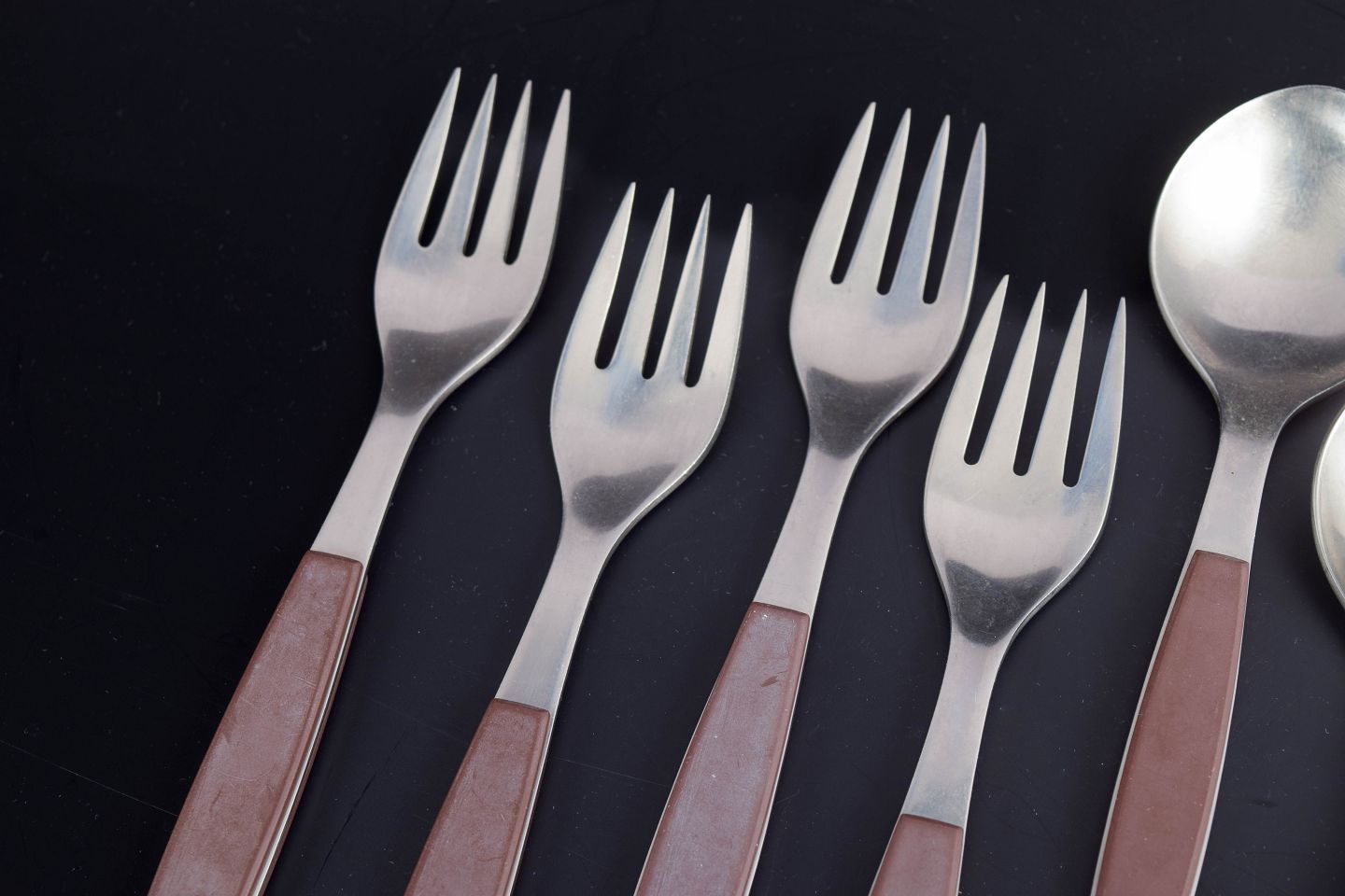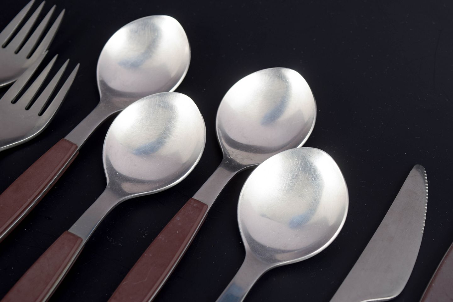 Set comprising four dinner knives, four dinner forks, and four table spoons in stainless steel with brown handles. The model is from the Strata series.