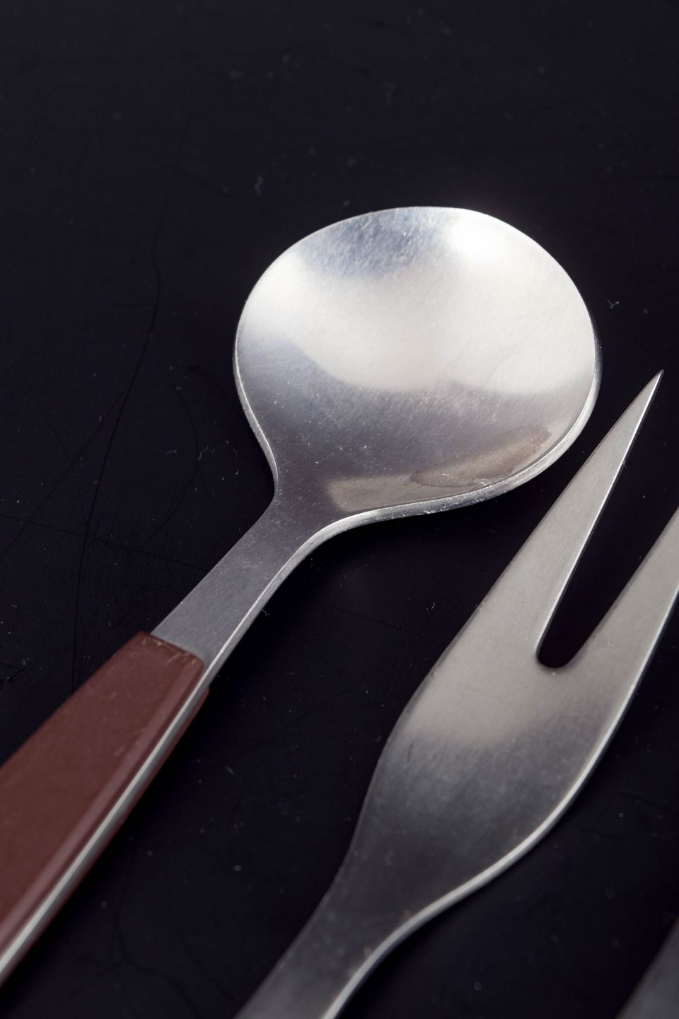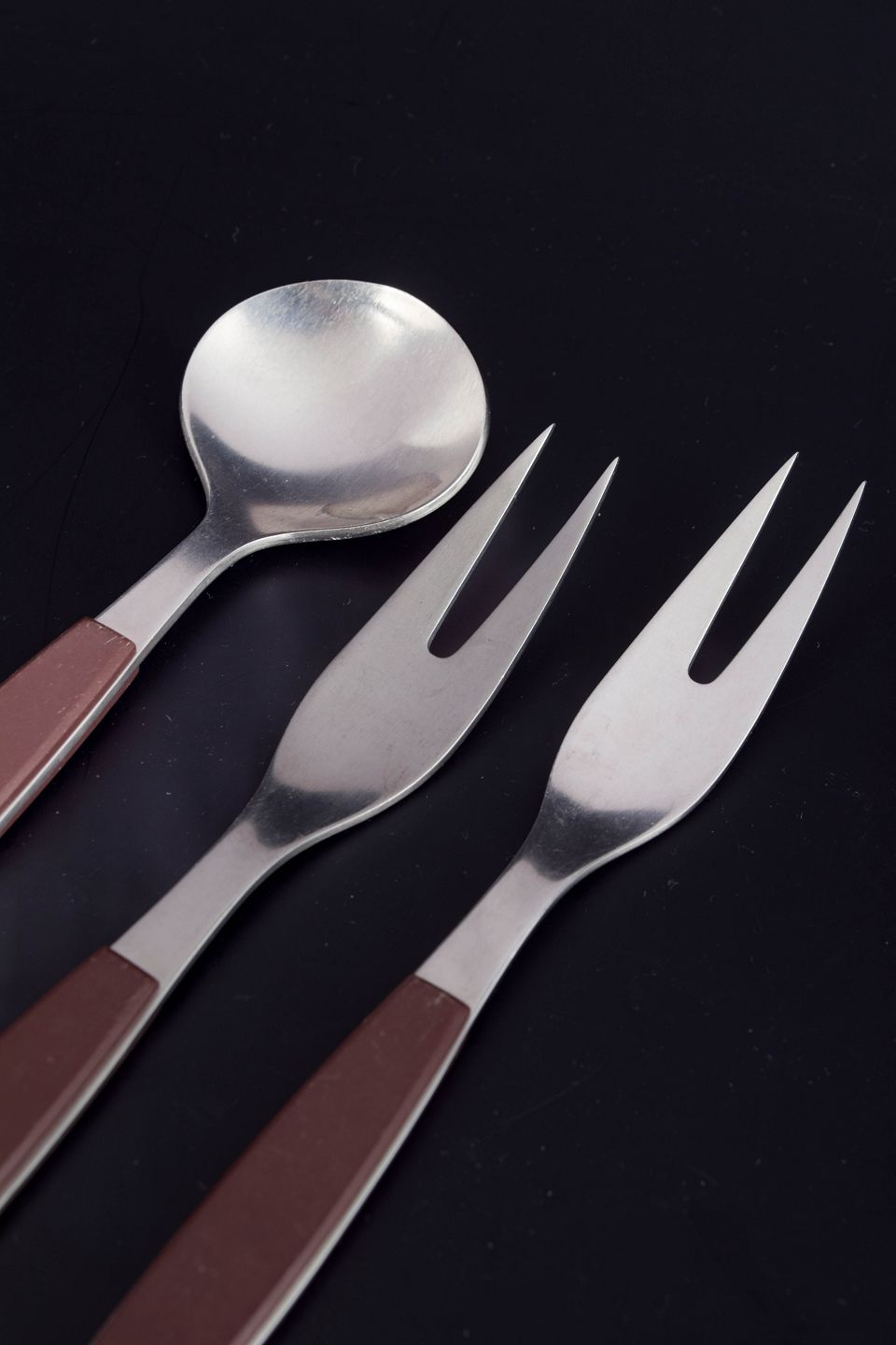 Set comprising two cold-meat/serving forks and a bouillon spoon in stainless steel with brown handles. The model is from the Strata series.