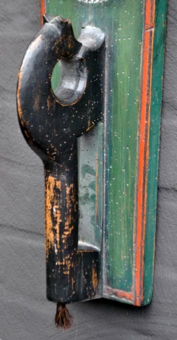 Danish mangle board, 19th century. Beech wood. With horse grip and carved carvings. Dated 1866 and engraved: ESSW. Painted green and red. L.: 61 cm.