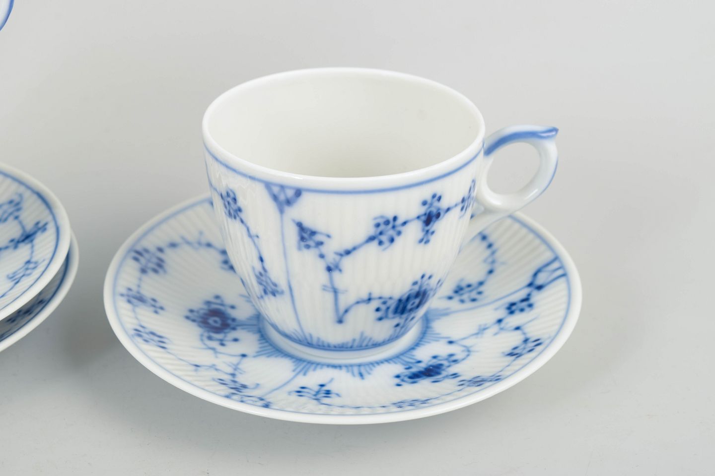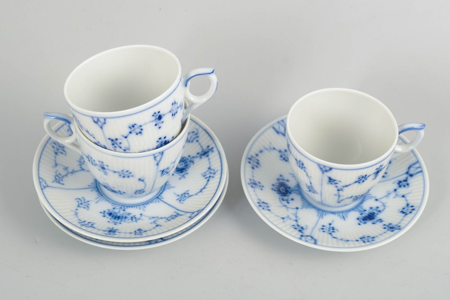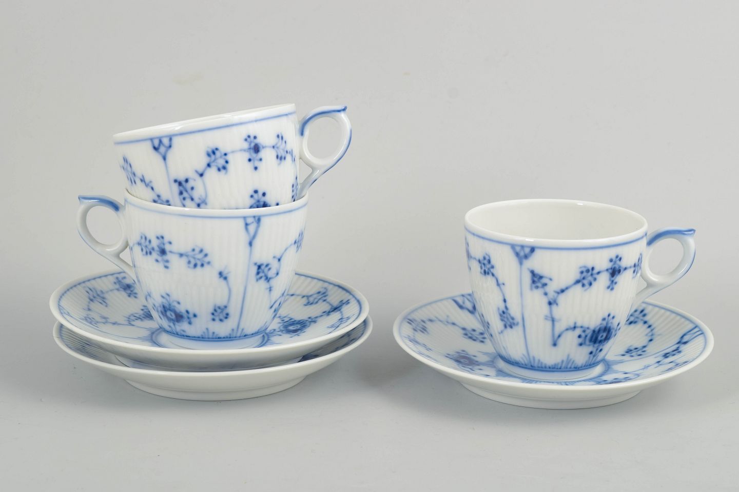 Porcelain coffee set from the Blue Fluted Plain series, consisting of cups and saucers for three persons, model 1/2162. Classic fluted form with hand-painted blue decoration.