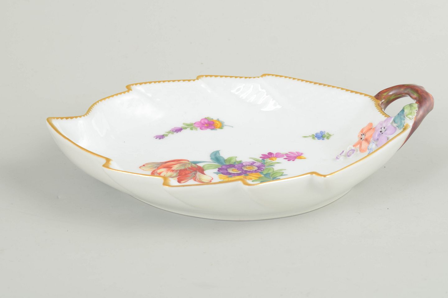 Leaf-shaped serving dish in white-glazed porcelain with hand-painted floral decoration from the Saxon Flower series, a gilt rim and an integrated handle; model 4/1599.