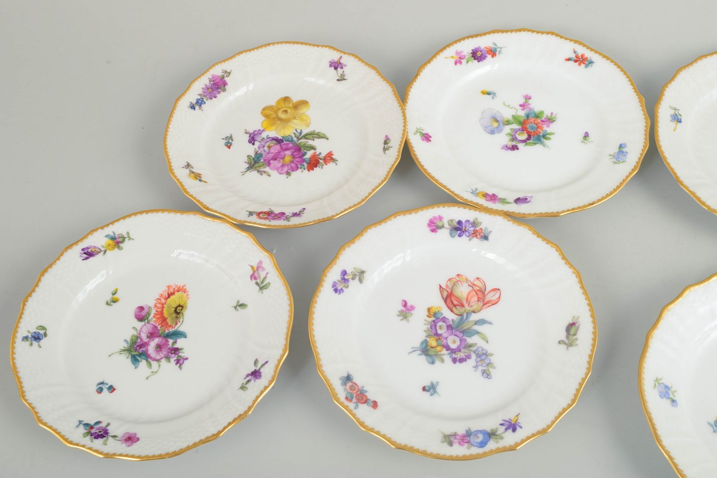 Set of eight cake plates in white-glazed porcelain with hand-painted floral decoration from the Saxon Flower series and a gilt rim; model 4/1627.