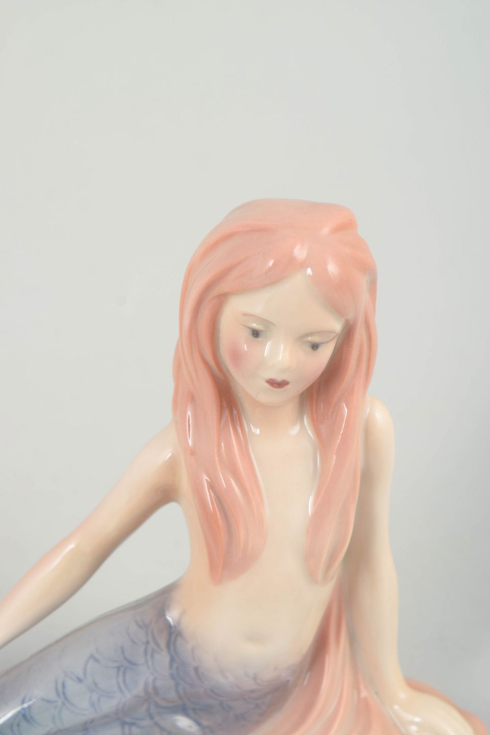 Porcelain figurine depicting The Little Mermaid, produced for the H.C. Andersen Collection. The figure is modelled in a reclining pose with a finely detailed blue-toned tail and long hair in soft pink hues. The underside is marked The Little Mermaid, No. 072/2500, indicating a limited edition.