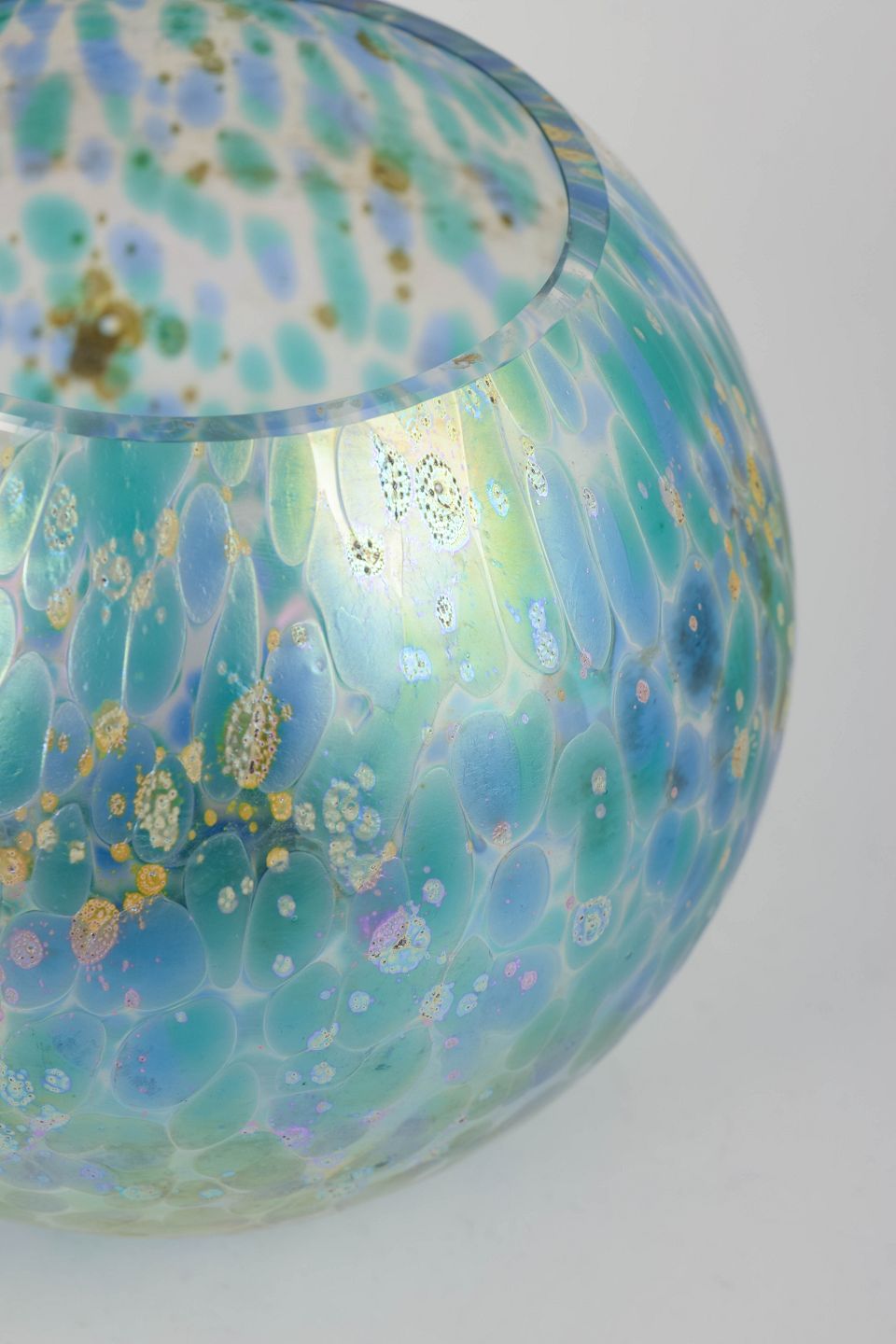 Spherical Art Nouveau art-glass vase with an iridescent surface in turquoise-blue and green tones, featuring a distinctive cellular pattern with subtle golden inclusions. The vibrant colour play and organic surface structure are characteristic of Lötz’s experimental glass production around 1900. The model appears as a sculptural object in its own right, with form and surface closely integrated.