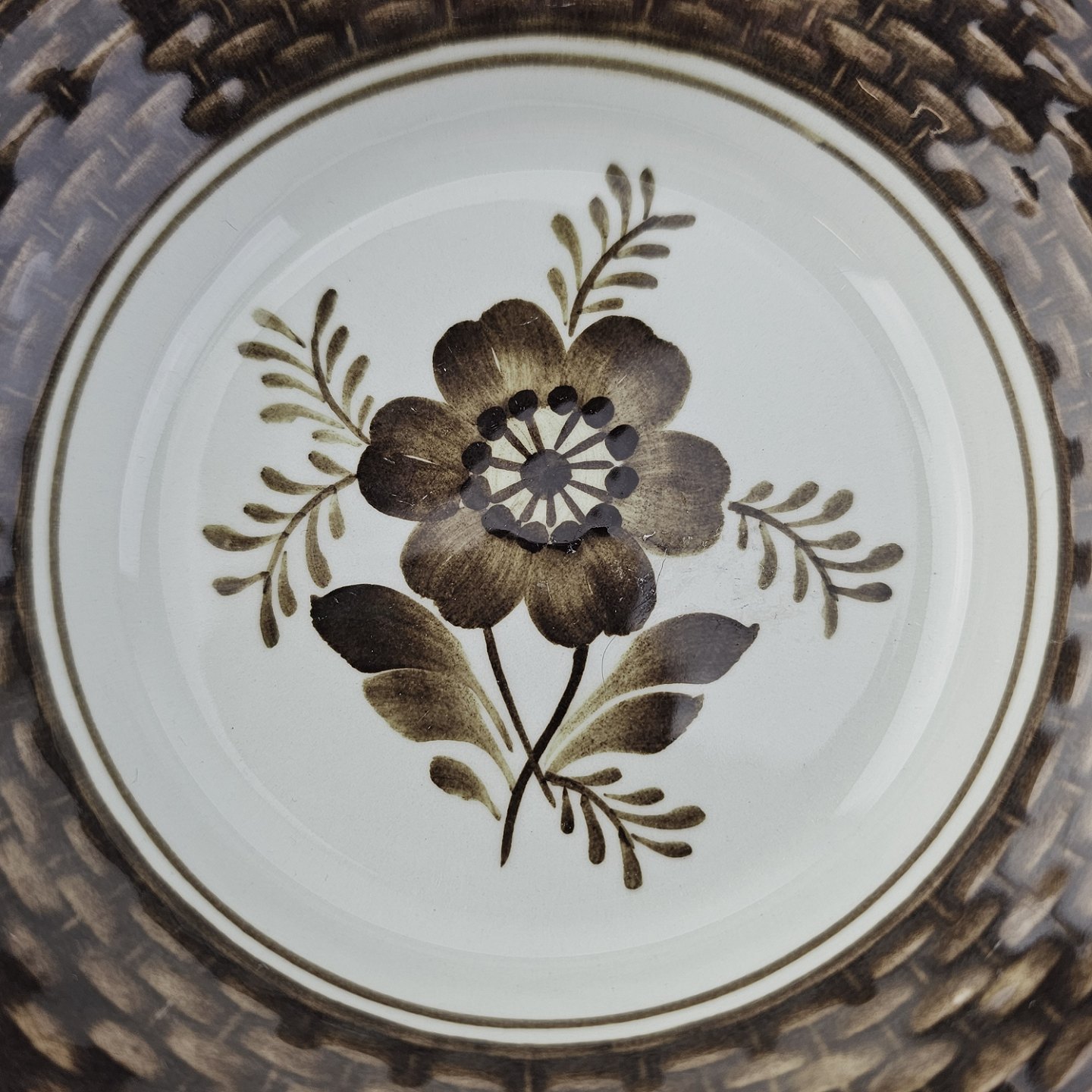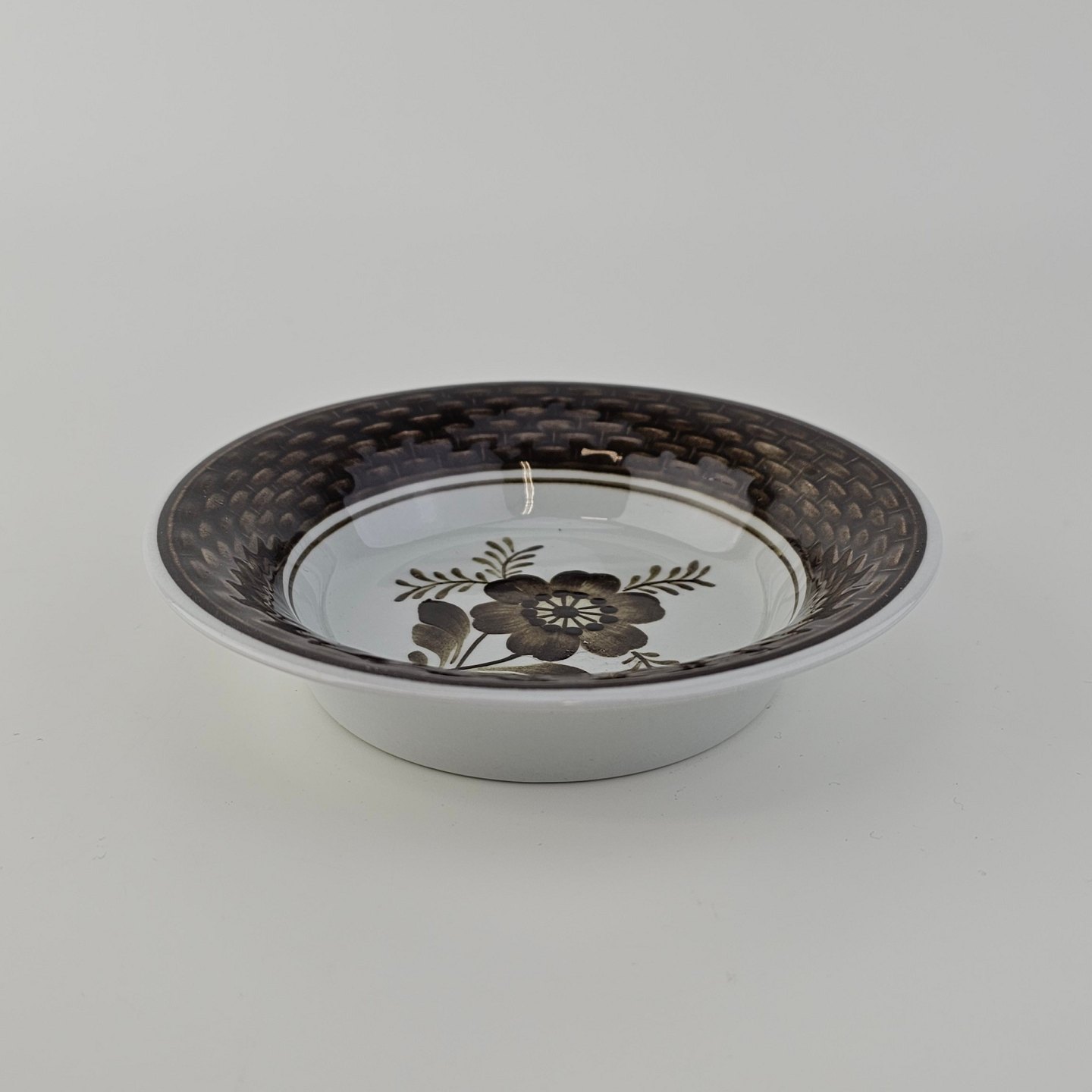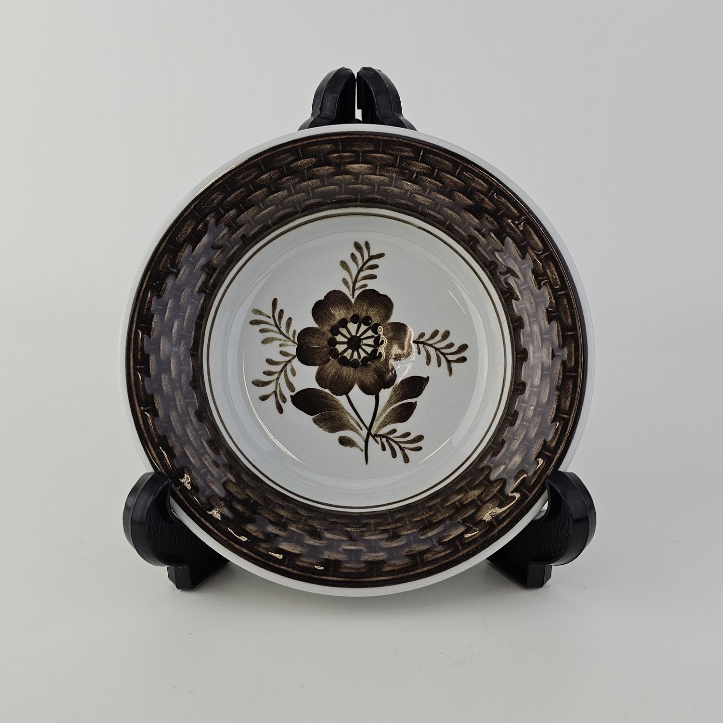 Fajancestellet med flettet kant og dekoration af brune blomster på lys baggrund med brun kant
