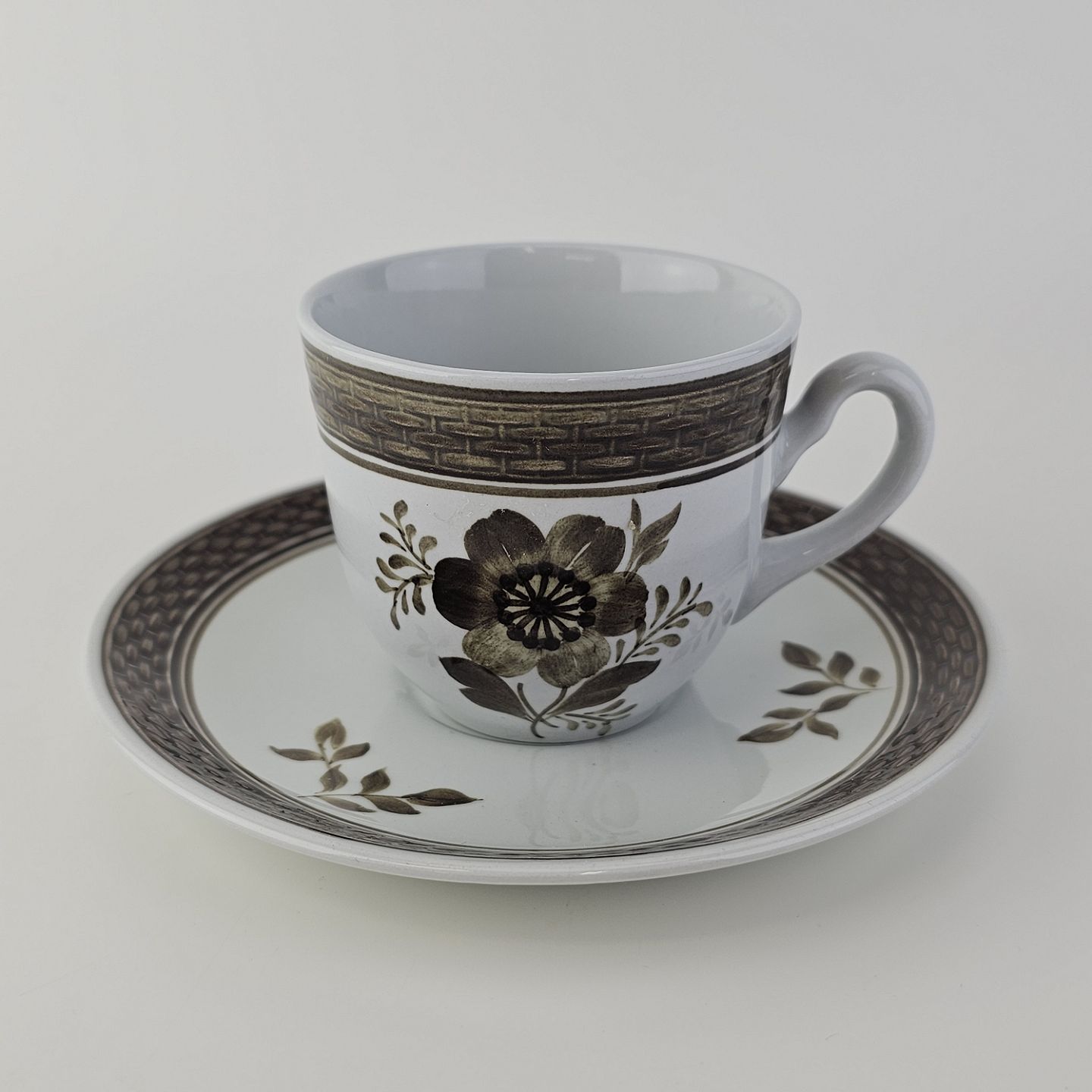 Moccakop med underkop i fajance fra stellet Brun Tranquebar fra år 1919