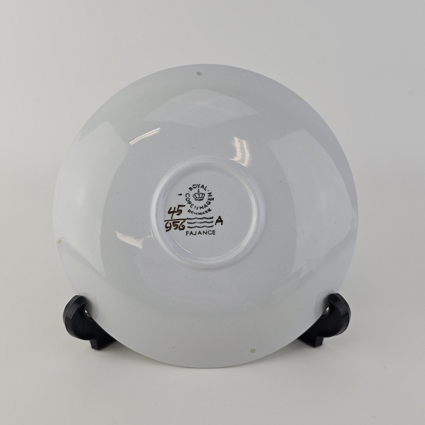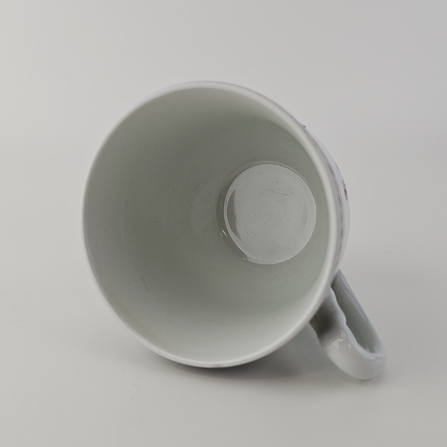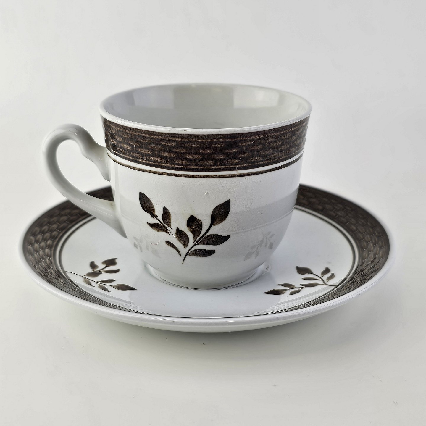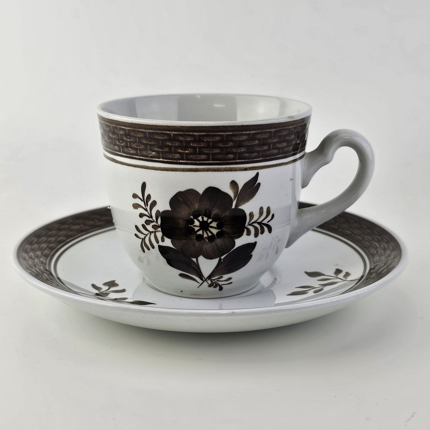 Kaffekop med underkop i fajance fra stellet Brun Tranquebar fra år 1919