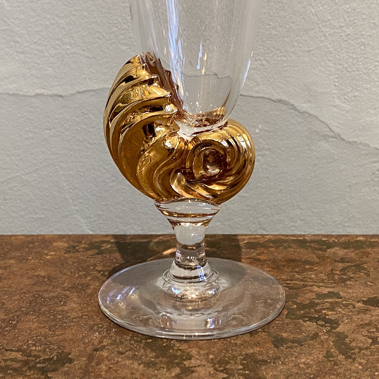 Darryle Hinz Champagne glass Neptune. Made at Holmegaard in 1999-2000. Designed by Darryle Hinz. Made of clear glass with a gilded decorative stem in the shape of a conch. The glasses have a slim shape and are suitable for serving champagne and sparkling wines. The design combines functionality with aesthetics. Dimensions: H. 20-20.5 cm. PREVIOUS PRICE 700 kr. NOW 550 kr.