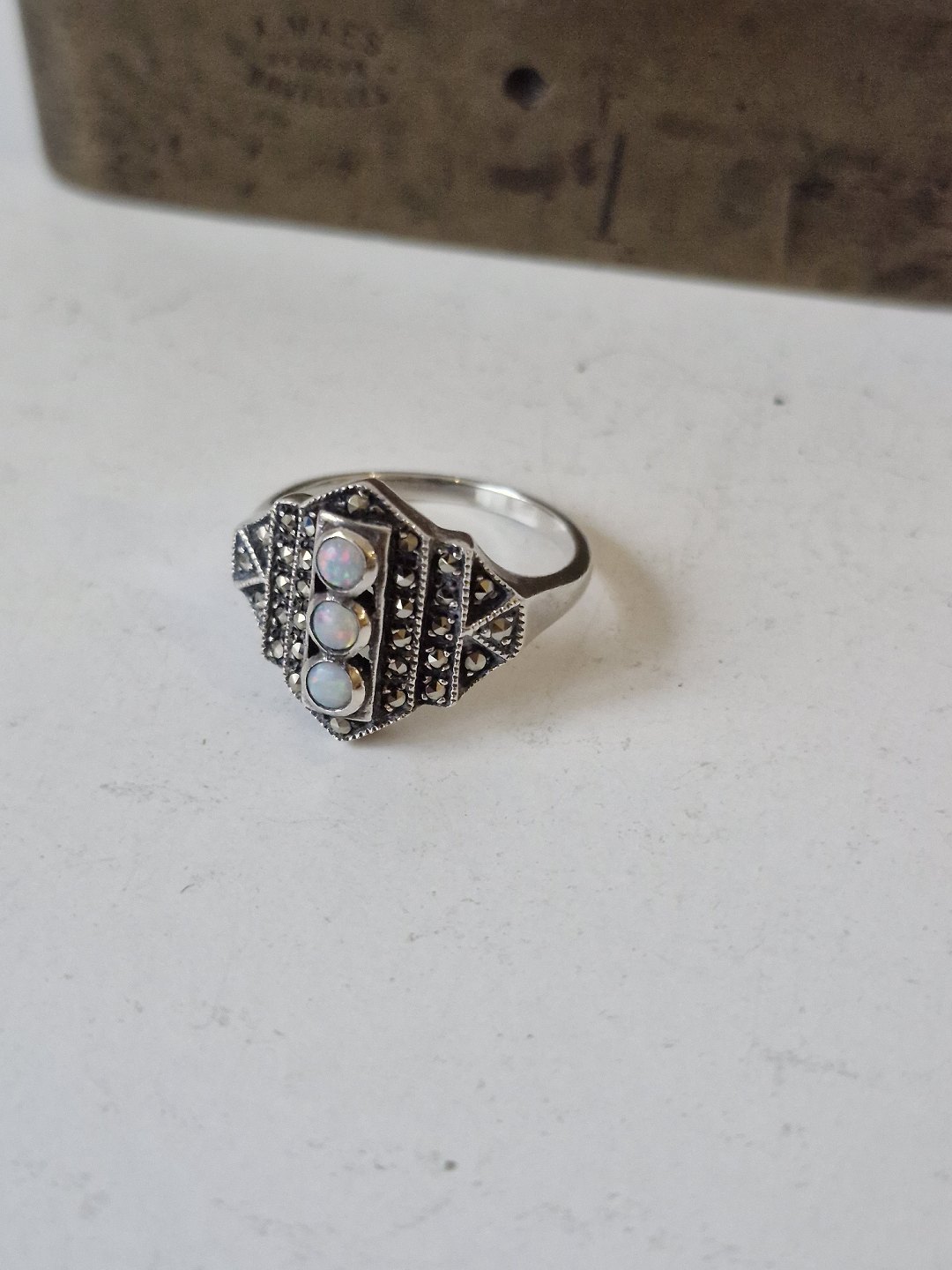 Art deco ring in sterling silver with three opals surrounded by marcasites.