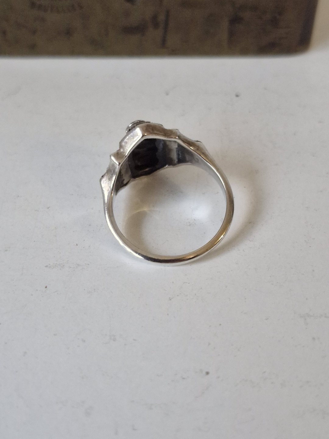 Art deco ring in sterling silver with three opals surrounded by marcasites