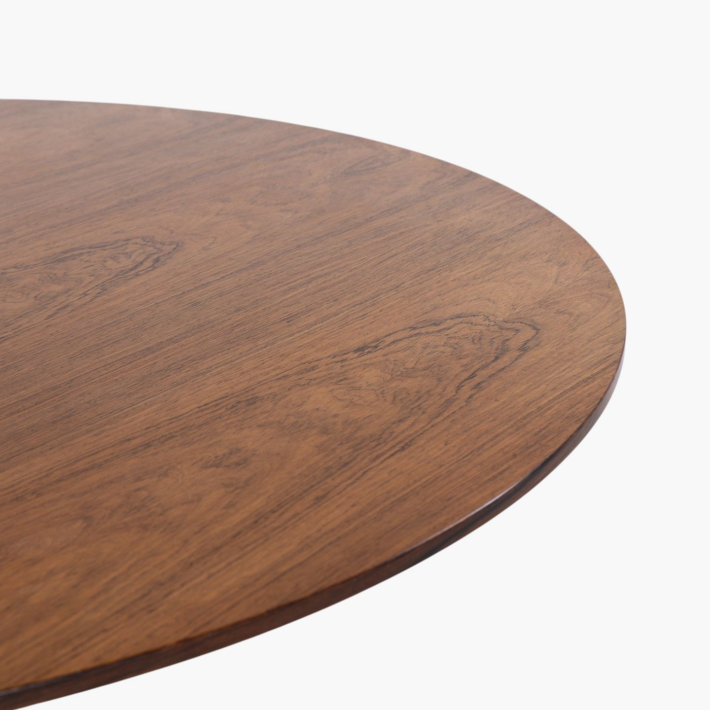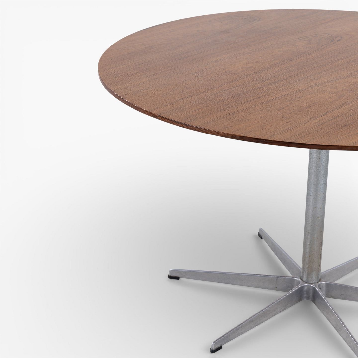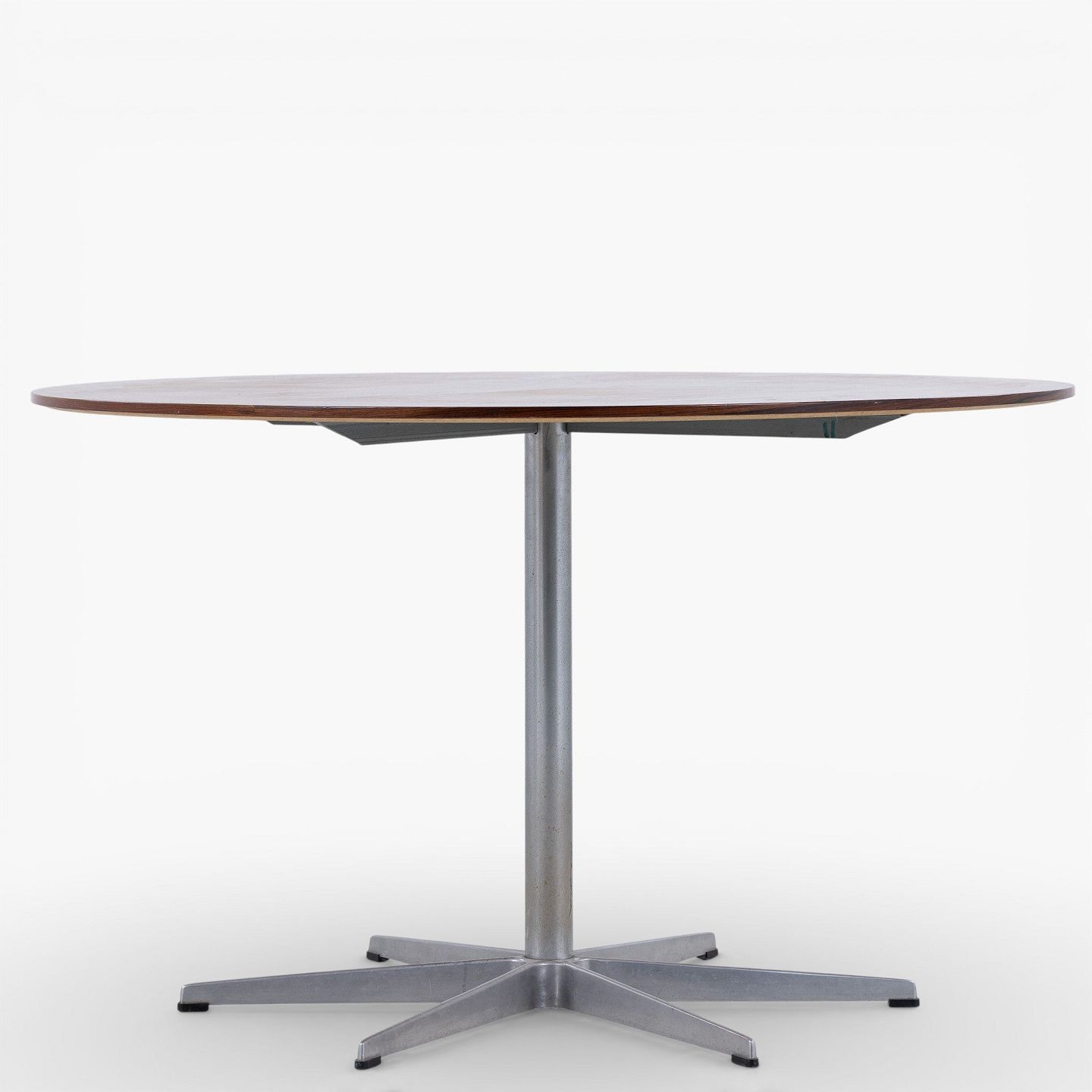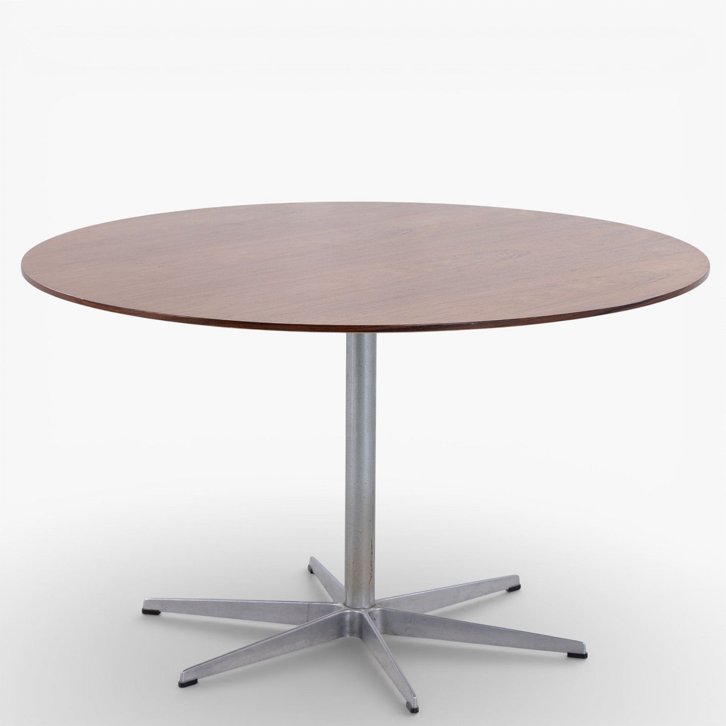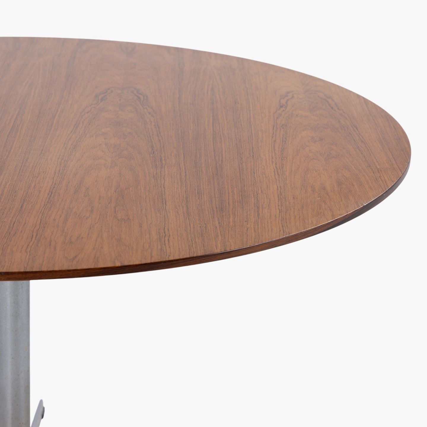 Dining table with round rosewood top on a six-legged steel frame.