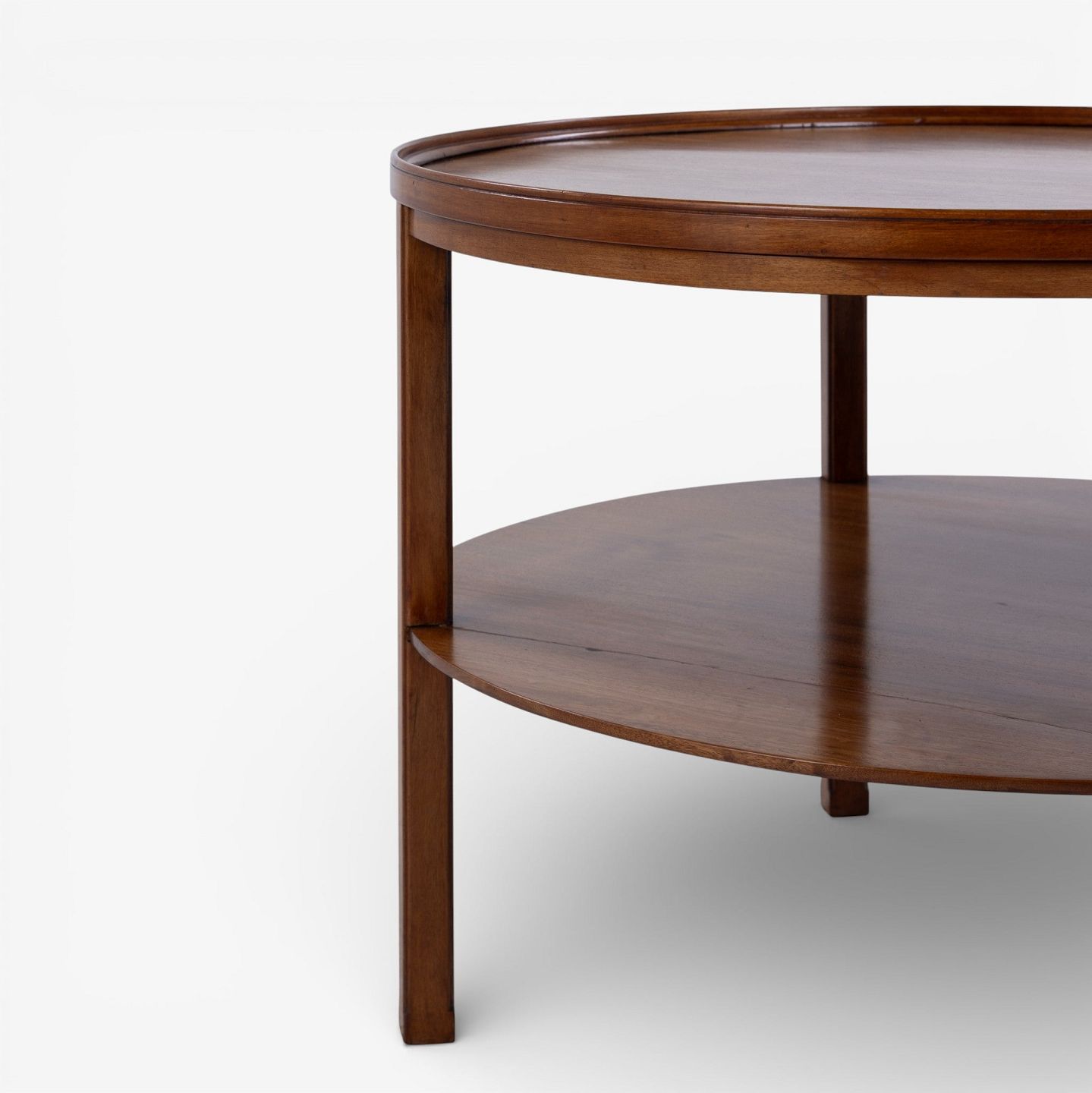 Round coffee table in patinated mahogany with underlying shelf. Manufacturer's mark.