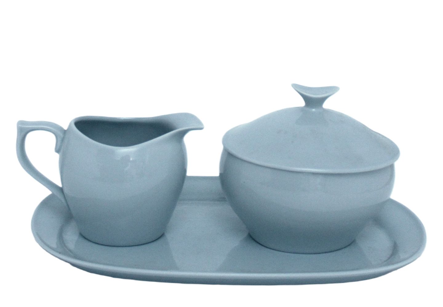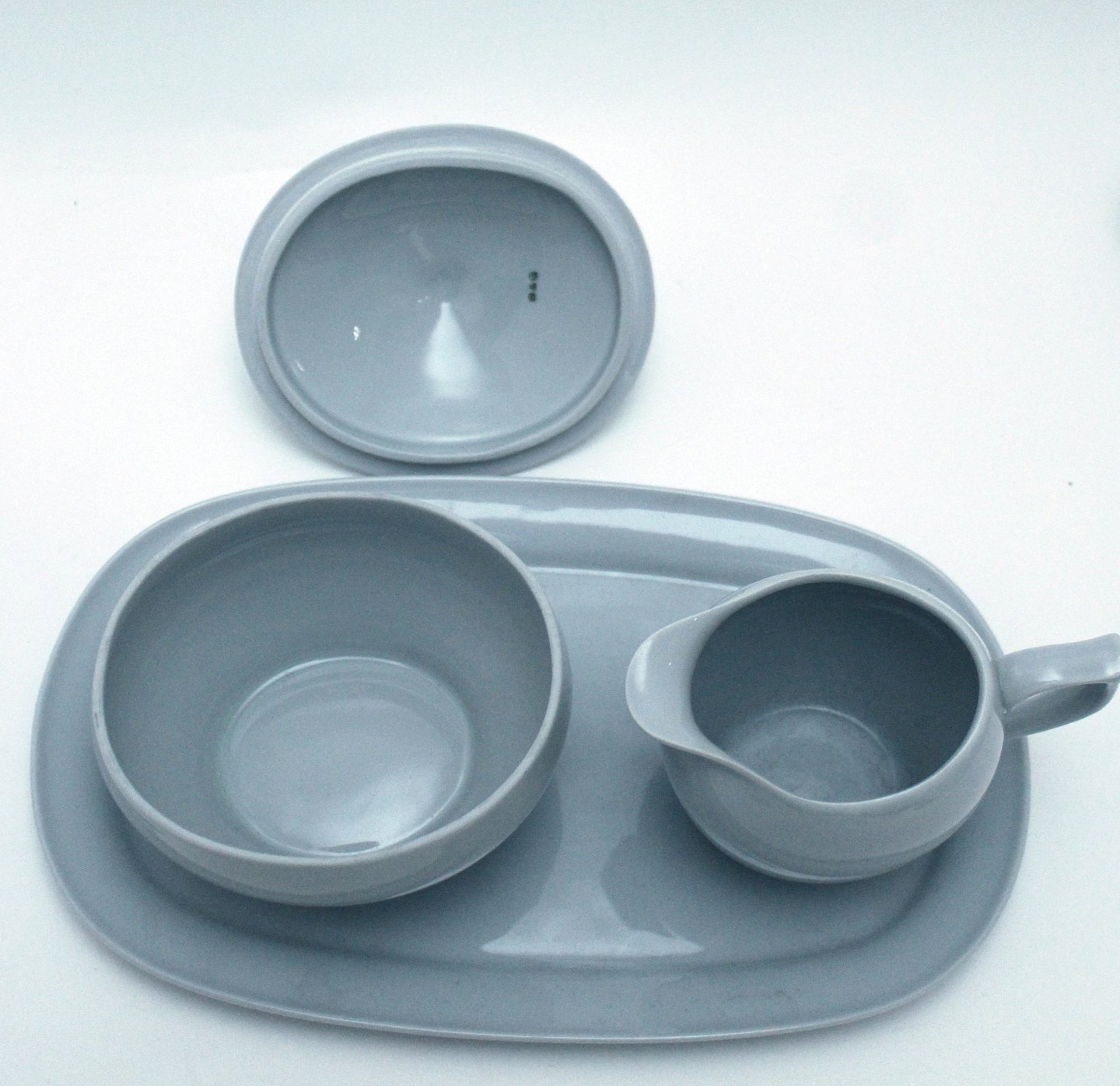 Text available in Danish: Bing & Grøndahl, Leda, Sart lysegrå/lyseblå stel. Sukker og flødesæt på bakke. Farven snyder meget, på billederne ser det lyseblåt ud og alt efter lyset ser det gråt ud.
