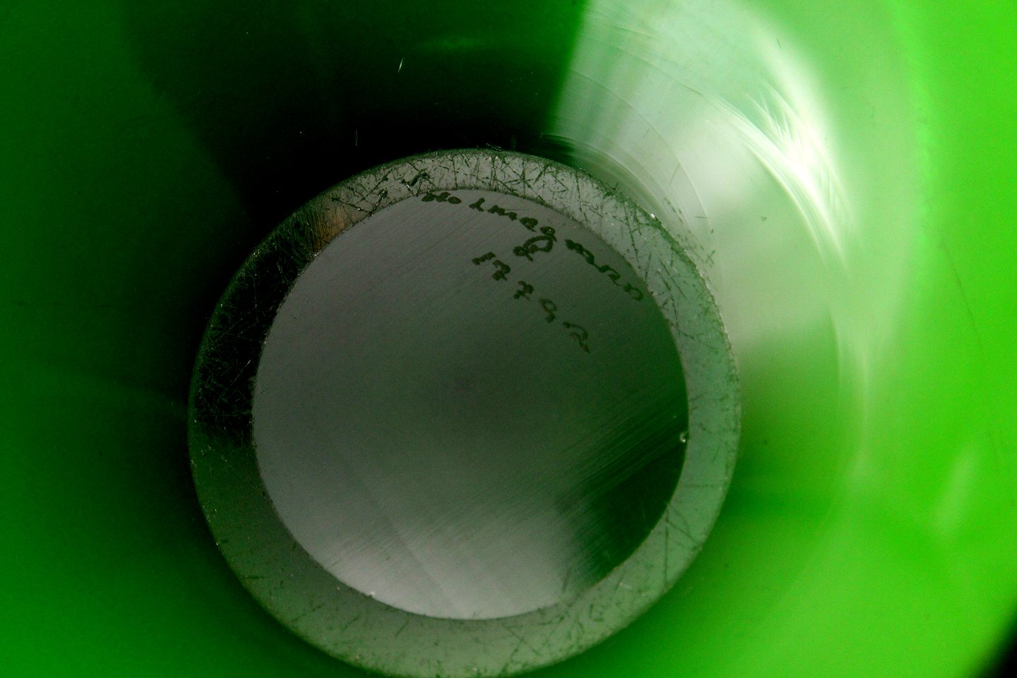 Text available in Danish: Holmegaard, Provence/Arne skål designet af Per Lütken i 1955. Flad skål i mellemstørrelse, ædelgrønt glas i god stand med enkelte brugsspor og ridser. Signeret Holmegaard PL17792. Højde 7,5 cm. Diameter 26 cm. Pris: 375 kr.