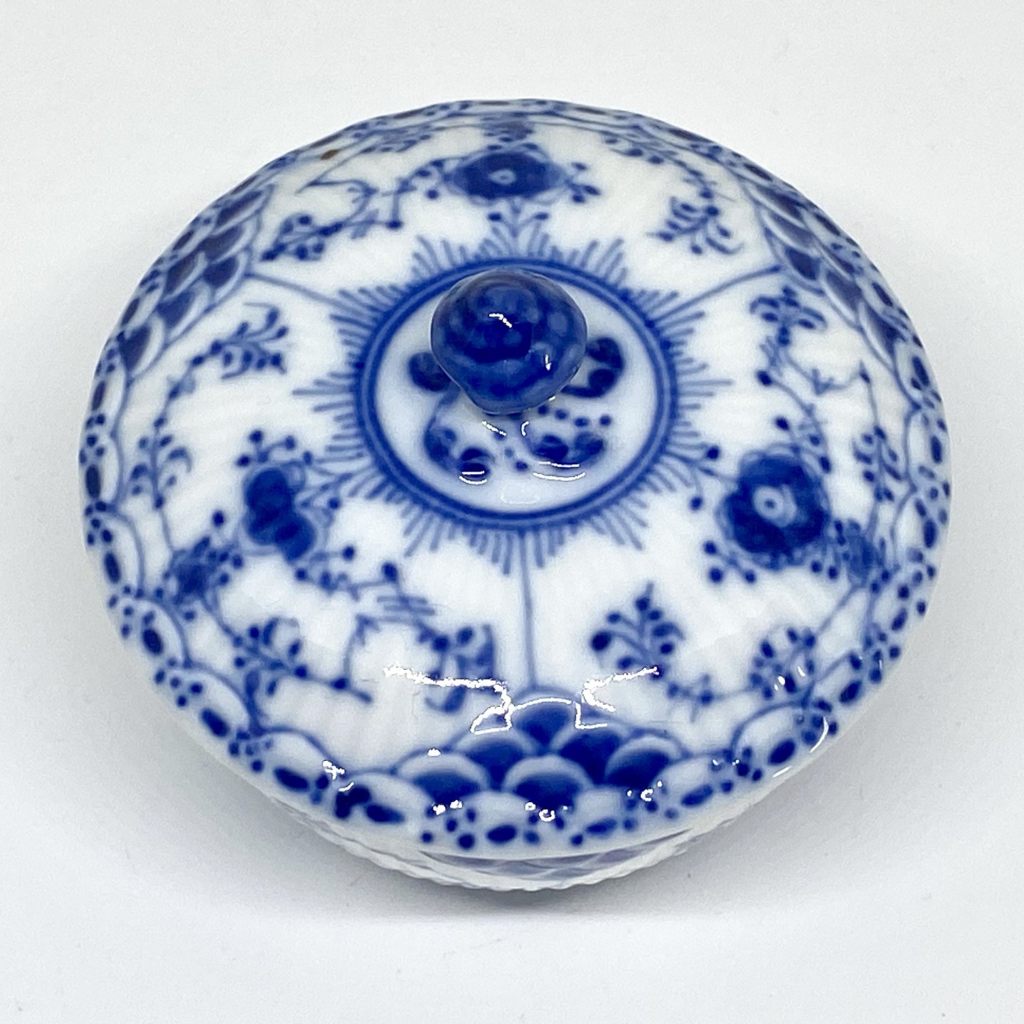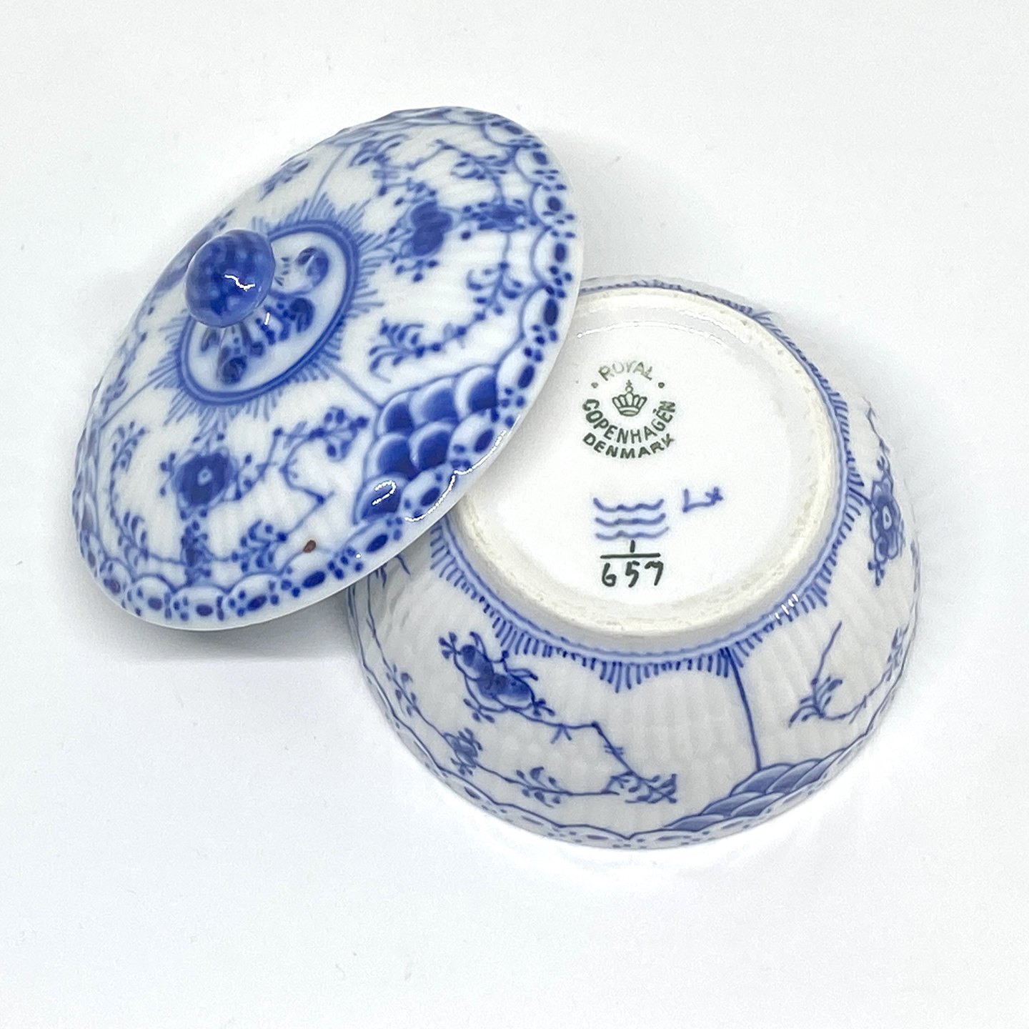 Royal Copenhagen/Kgl. Blue Fluted half lace. Small sugar bowl with lid. Decoration number 1/657. Bowl 2nd grade, lid 3rd grade. Dimensions: Ø 8.5 cm. H. 8 cm.