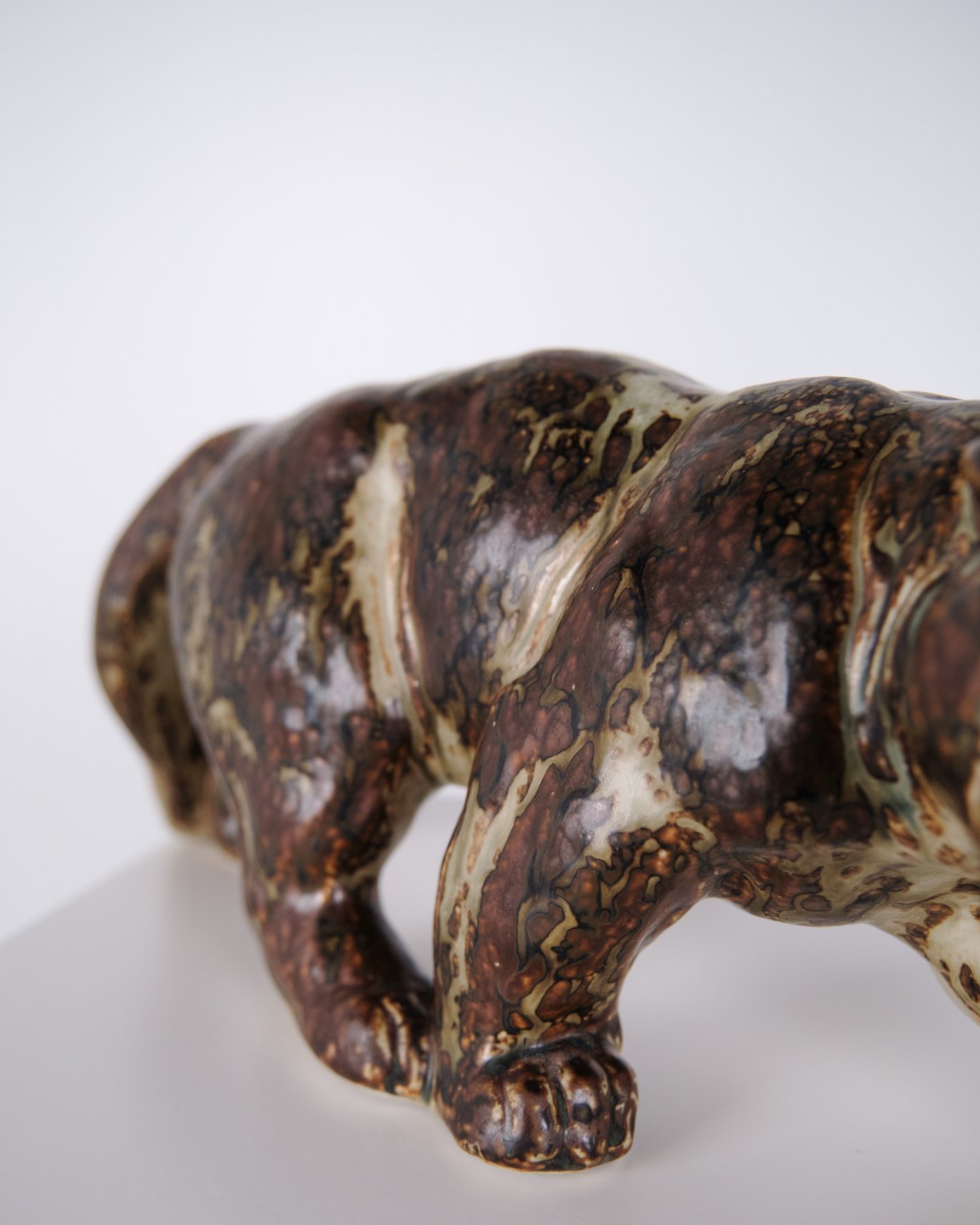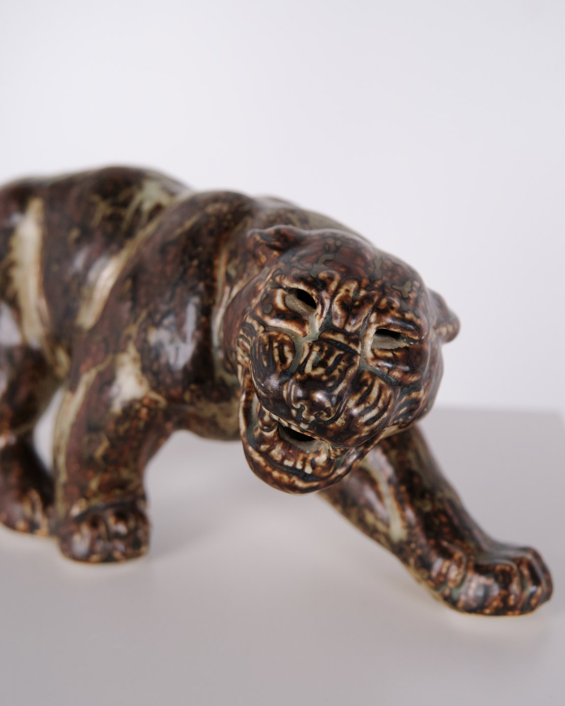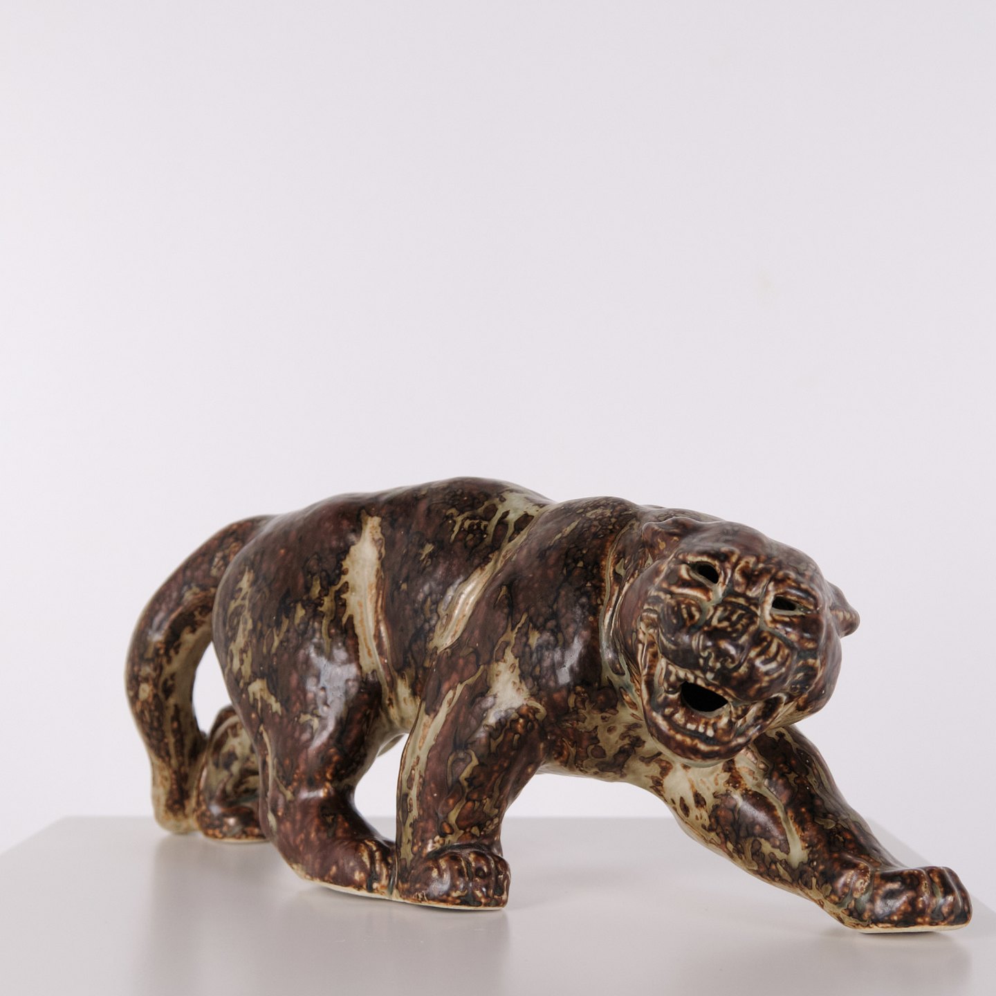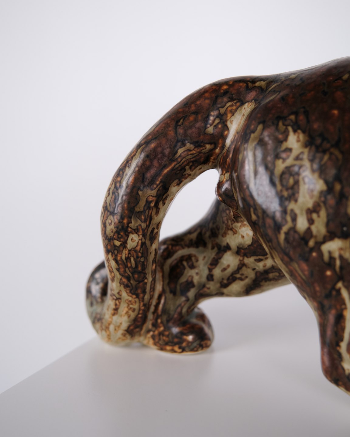 Stoneware figure depicting a panther, model 20283, designed by Knud Kyhn for Royal Copenhagen. The figure is executed in stoneware and is part of Kyhn’s animal sculptures produced at Royal Copenhagen, recognised for their emphasis on form and movement within Danish ceramic design.