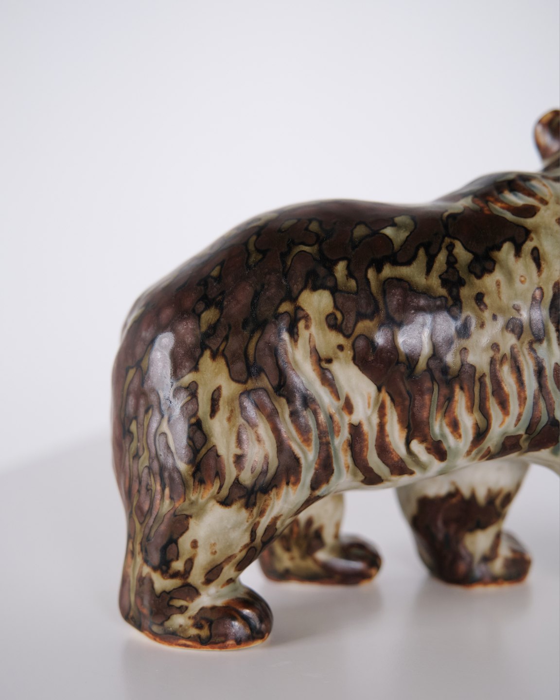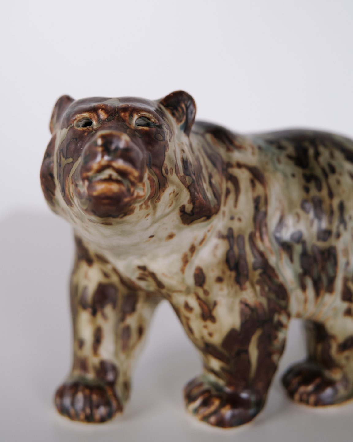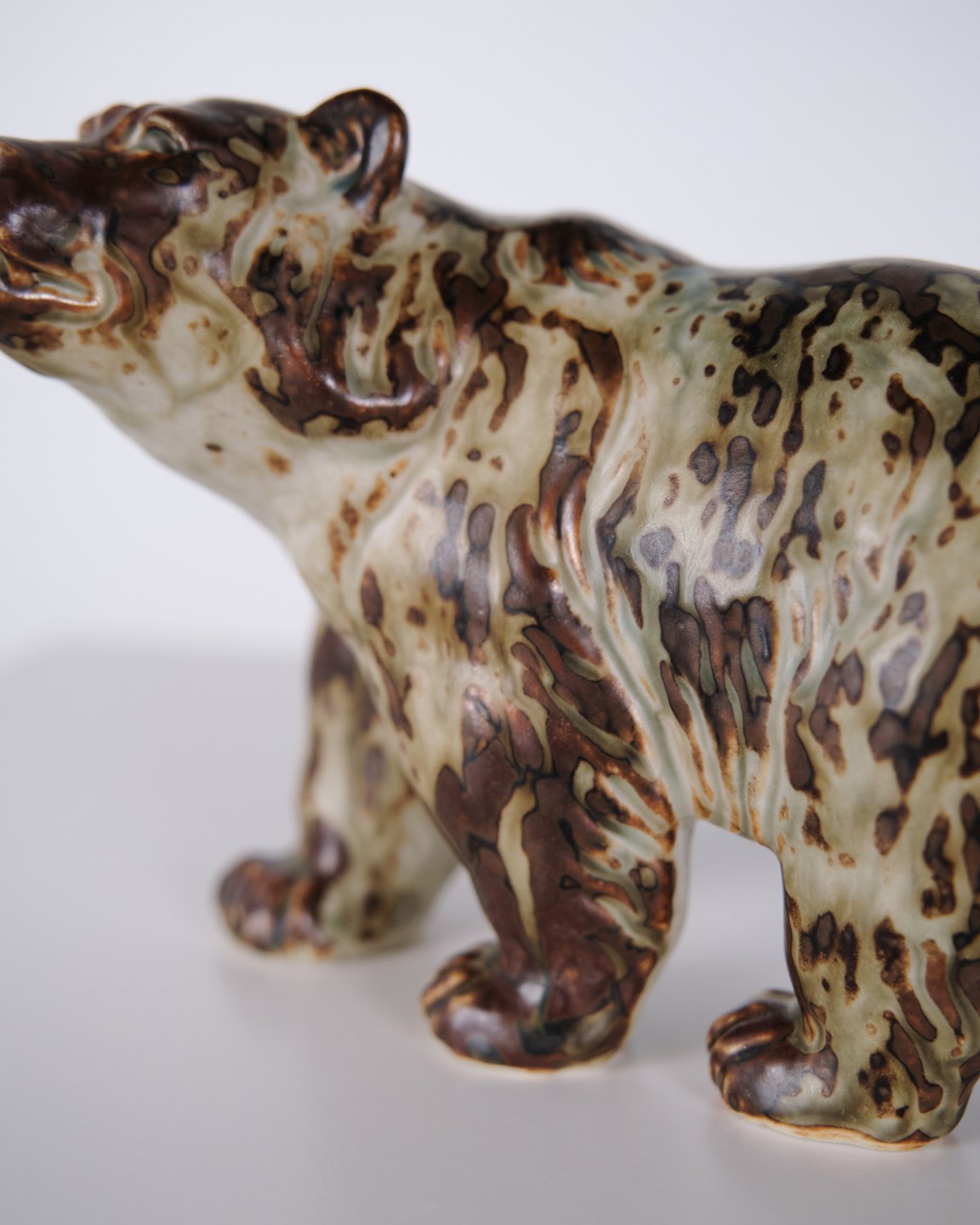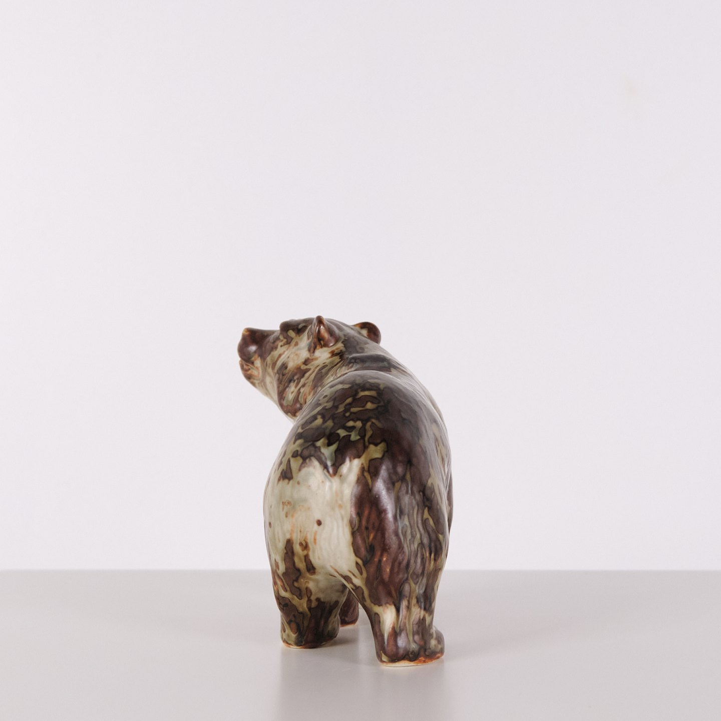 Ceramic figure depicting a bear, model 20155, designed by Knud Kyhn for Royal Copenhagen. Executed in stoneware and produced at Royal Copenhagen around 1960. The model is part of Kyhn’s animal sculptures and represents Danish ceramic design from the mid-20th century.
