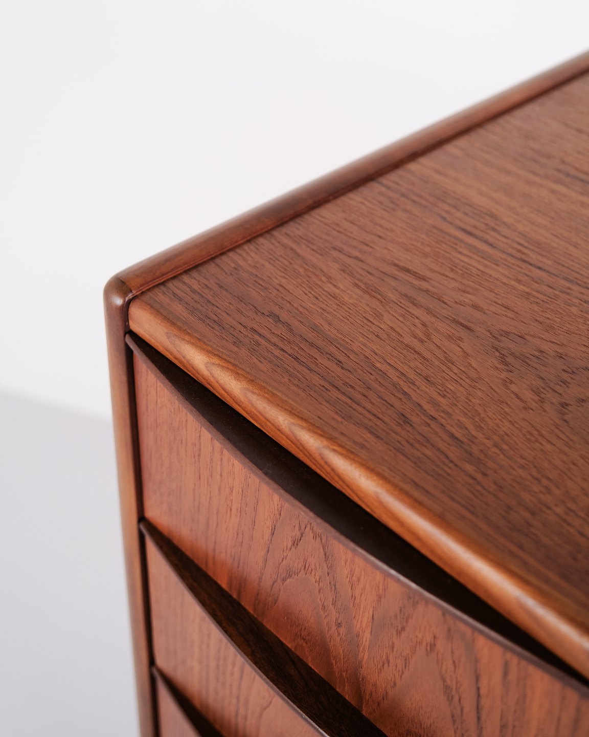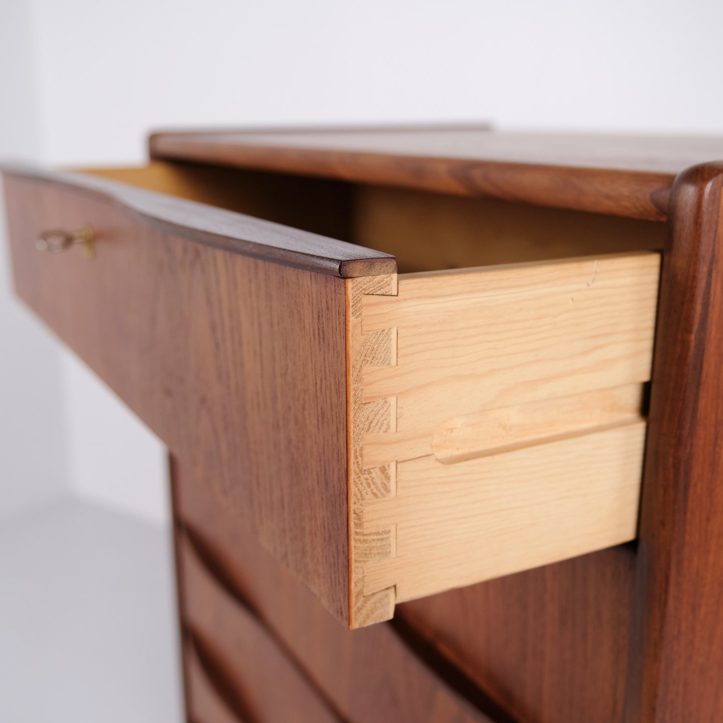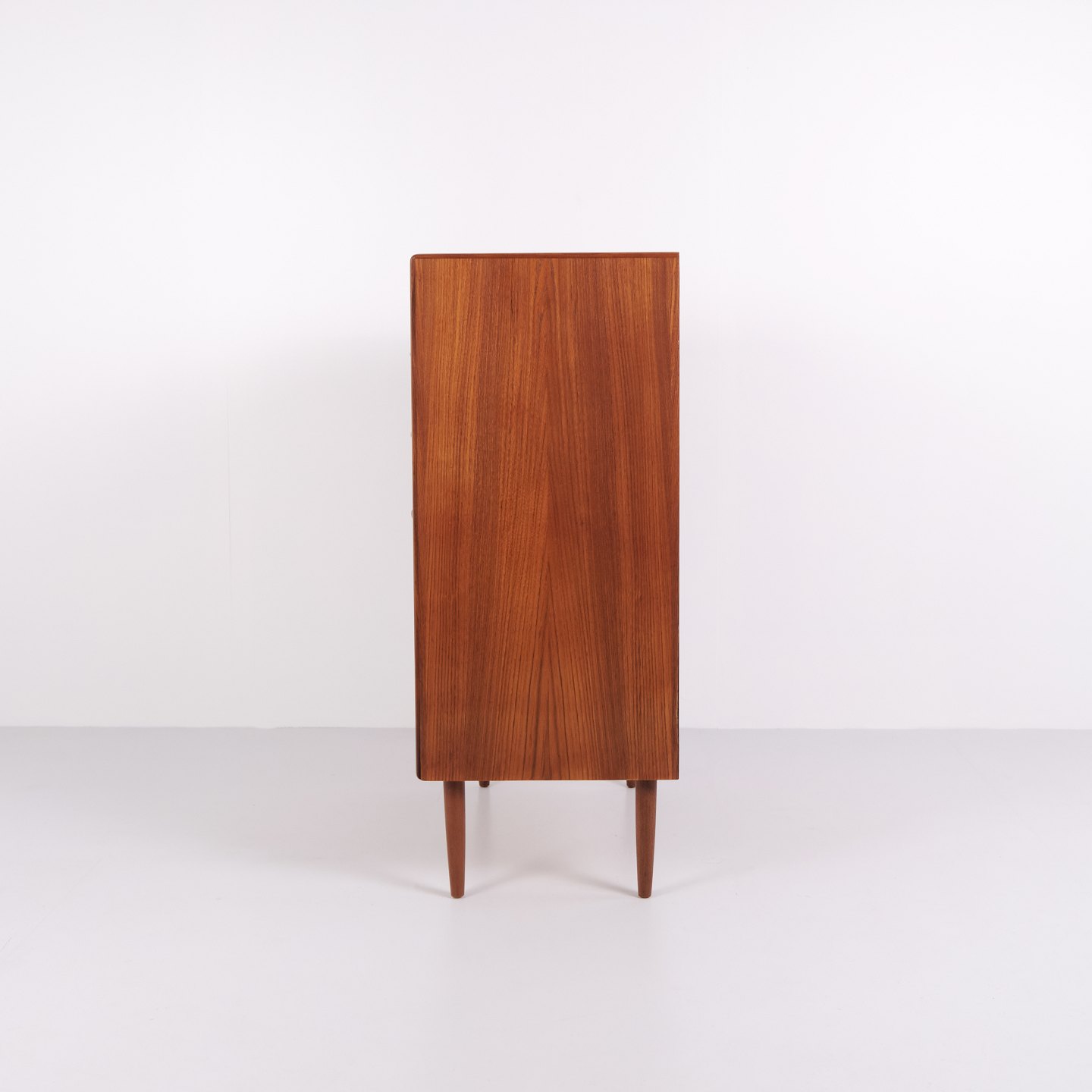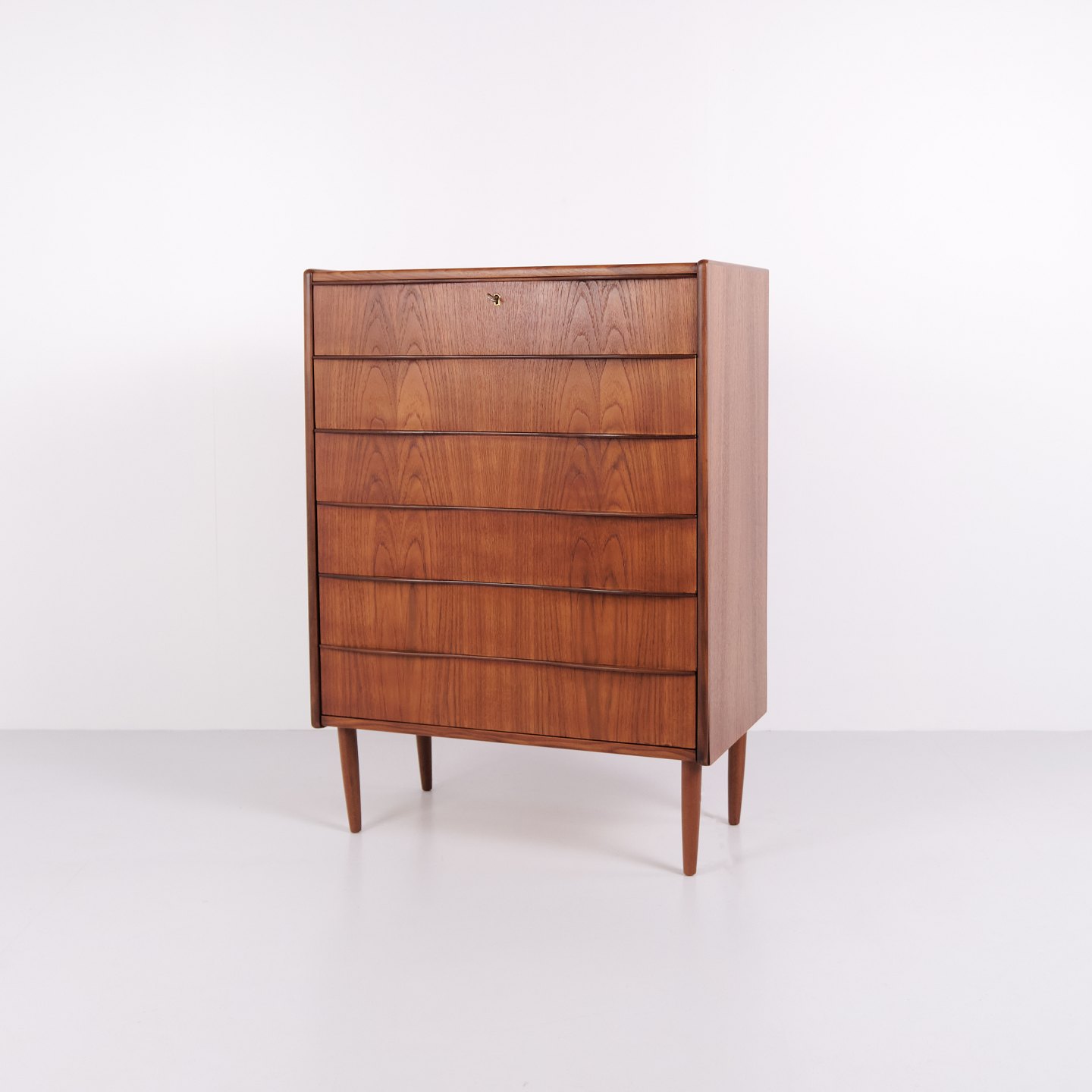 Chest of drawers made of teak with six drawers and original handles. The piece is representative of Danish furniture design from the 1950s, focusing on functionality, storage and material quality. The tall format makes it suitable for use in a bedroom, hallway or living area.