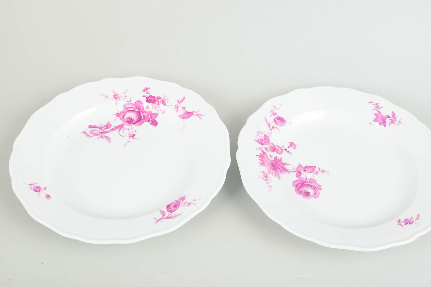 Set of two white-glazed porcelain plates decorated with hand-painted floral motifs in pink tones.