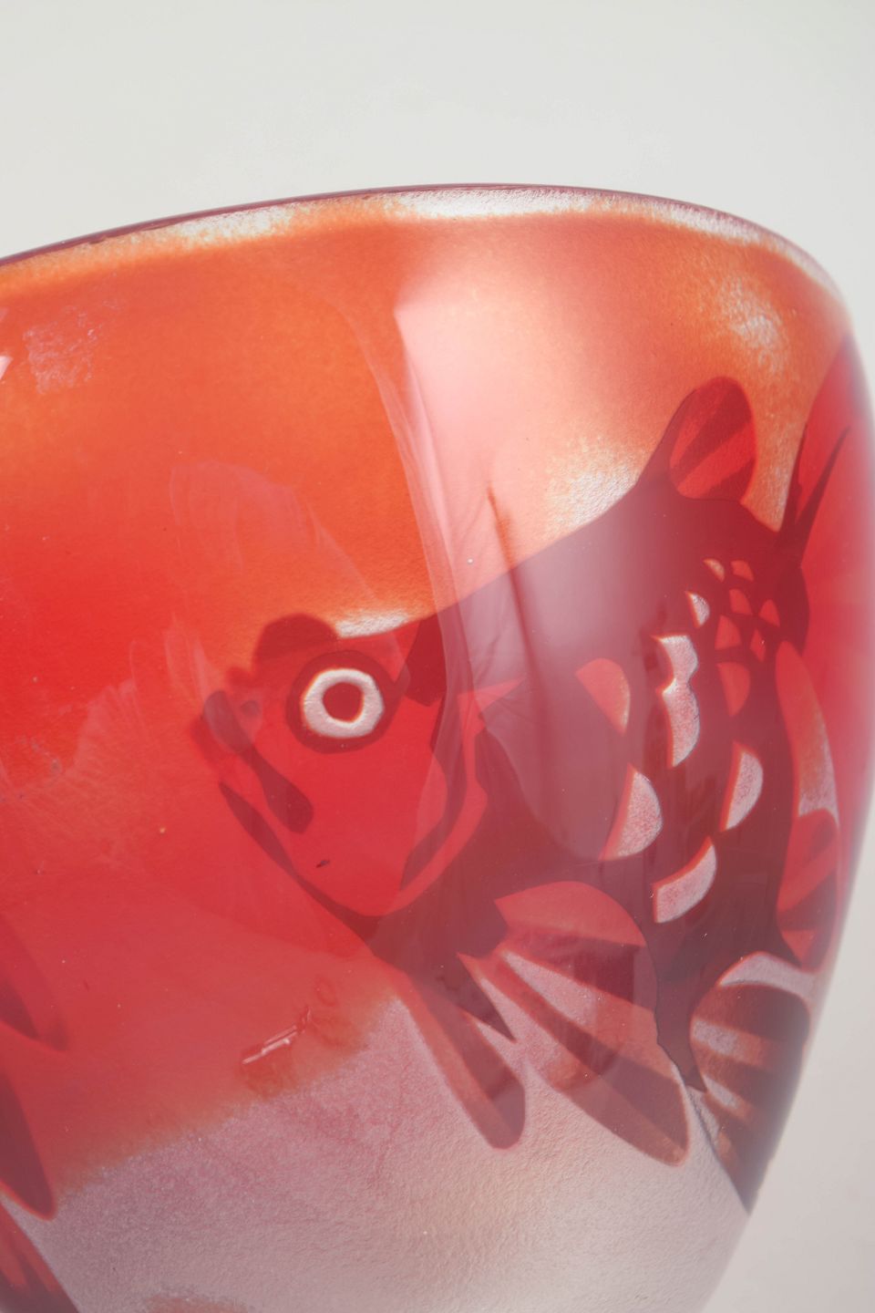 Bowl in clear and red-toned art glass with encased fish motifs and a frosted base, signed Hoff.