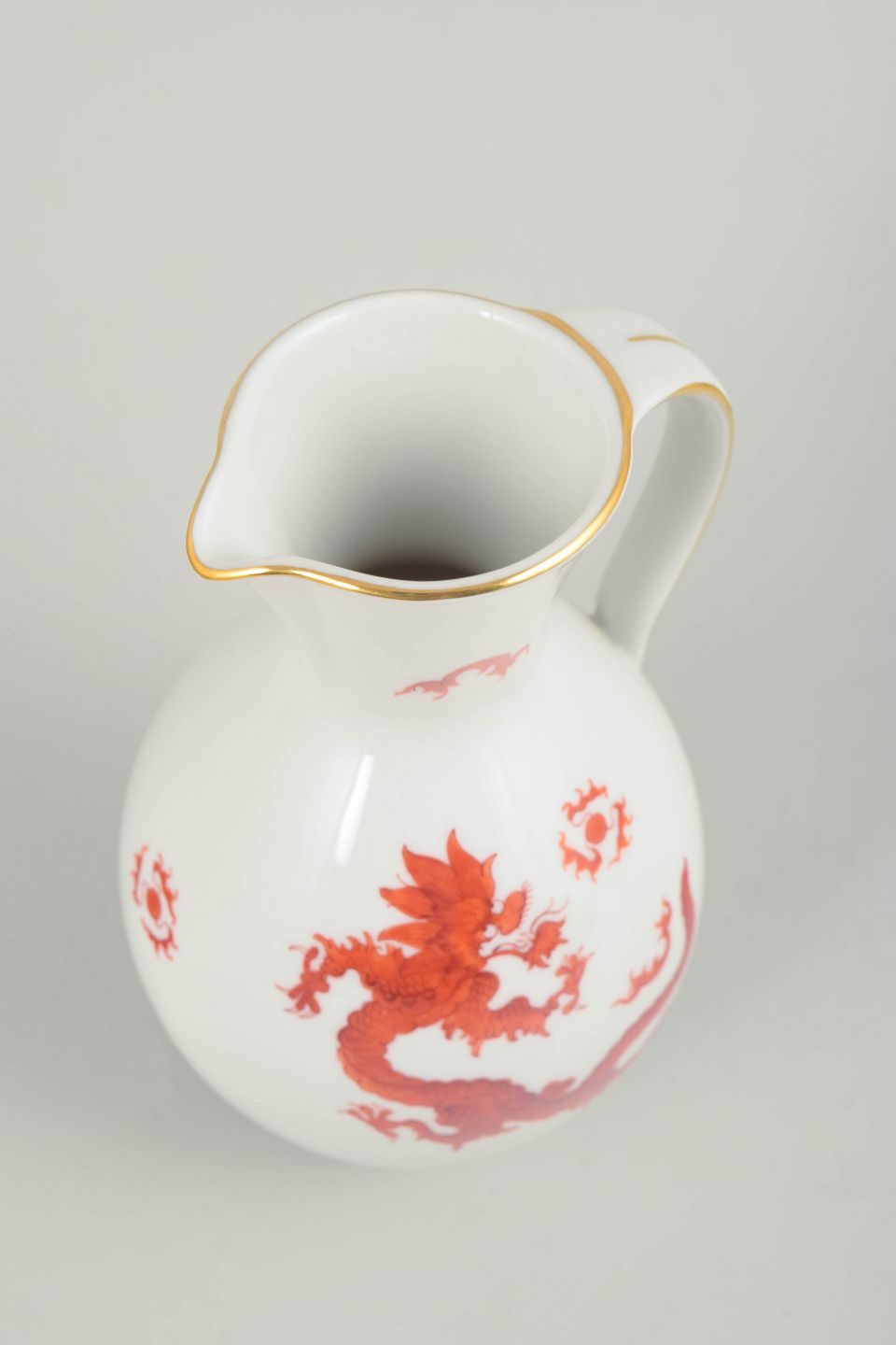 Baluster-shaped jug in white-glazed porcelain decorated with a red Ming dragon and a gilt rim. The model was produced in the Meissen area and is not made by the Royal Meissen manufactory.