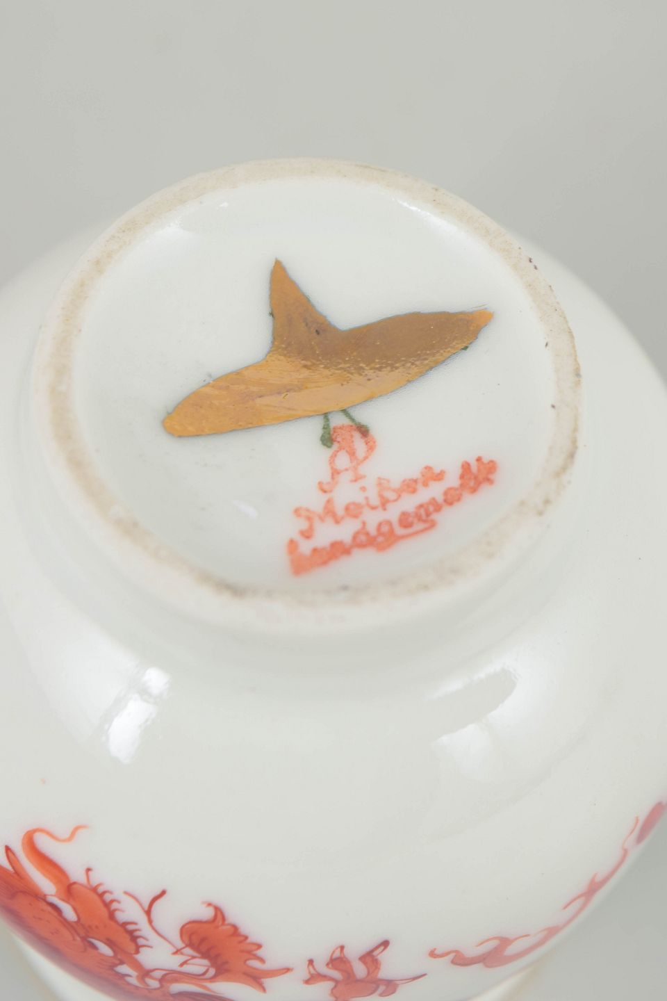 Small baluster-shaped vase in white-glazed porcelain decorated with a red Ming dragon and a gilt rim. The model is marked to the base and was produced in the Meissen area, but not by the Royal Meissen manufactory.