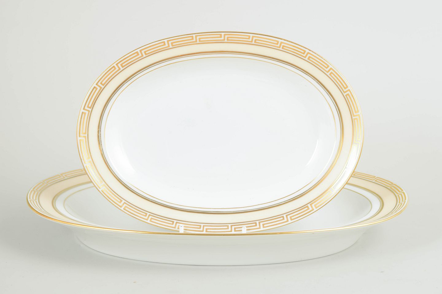 Set of two oval serving trays in white-glazed porcelain with a gilded rim and geometric Art Deco border; model 18 and 316.