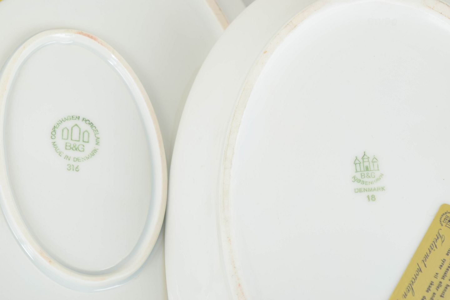 During the 1920s, Bing & Grøndahl produced a range of refined serving pieces characterised by geometric ornamentation inspired by the Art Deco movement. The contrast between the white porcelain ground and the gilded border creates a clean and elegant appearance typical of formal tableware from the interwar period.