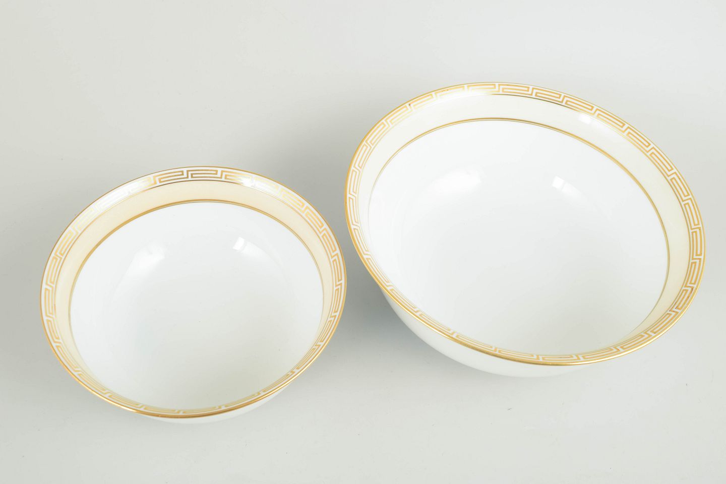 Two bowls in white-glazed porcelain with a gilt geometric border in a classic Art Deco style along the rim.