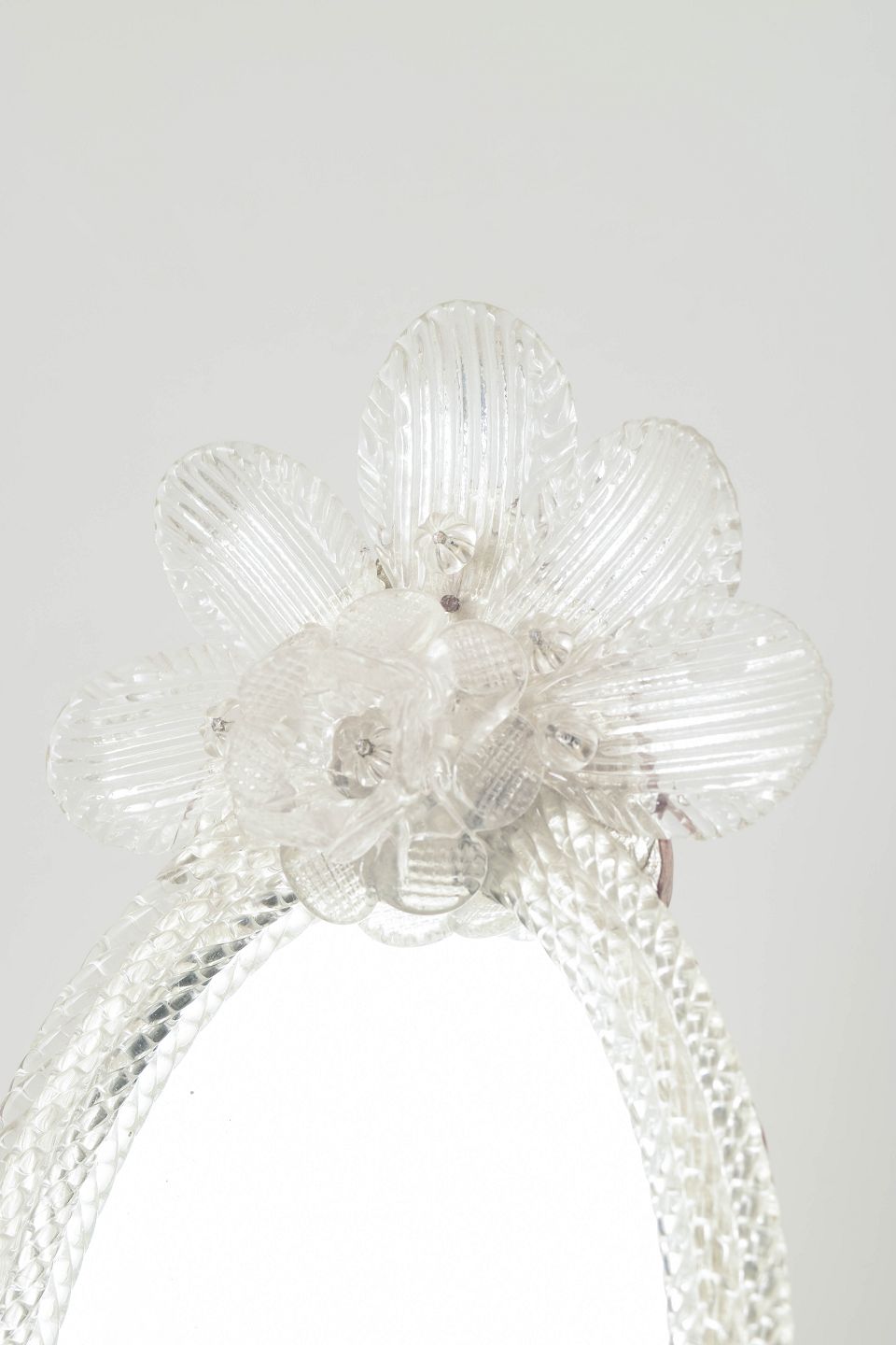 Oval mirror with an ornate clear-glass frame, decorated with floral and leaf motifs and matching feet; Murano.