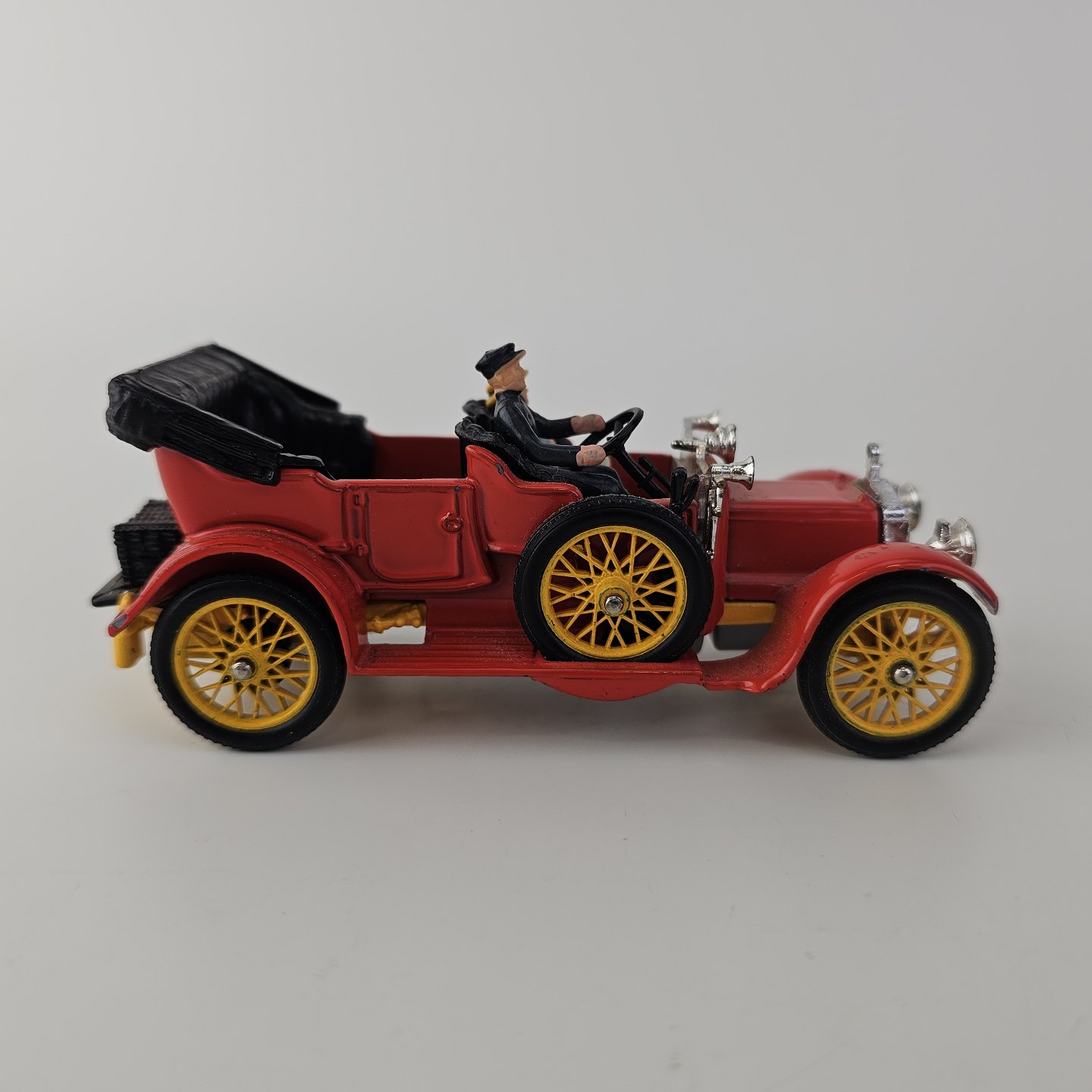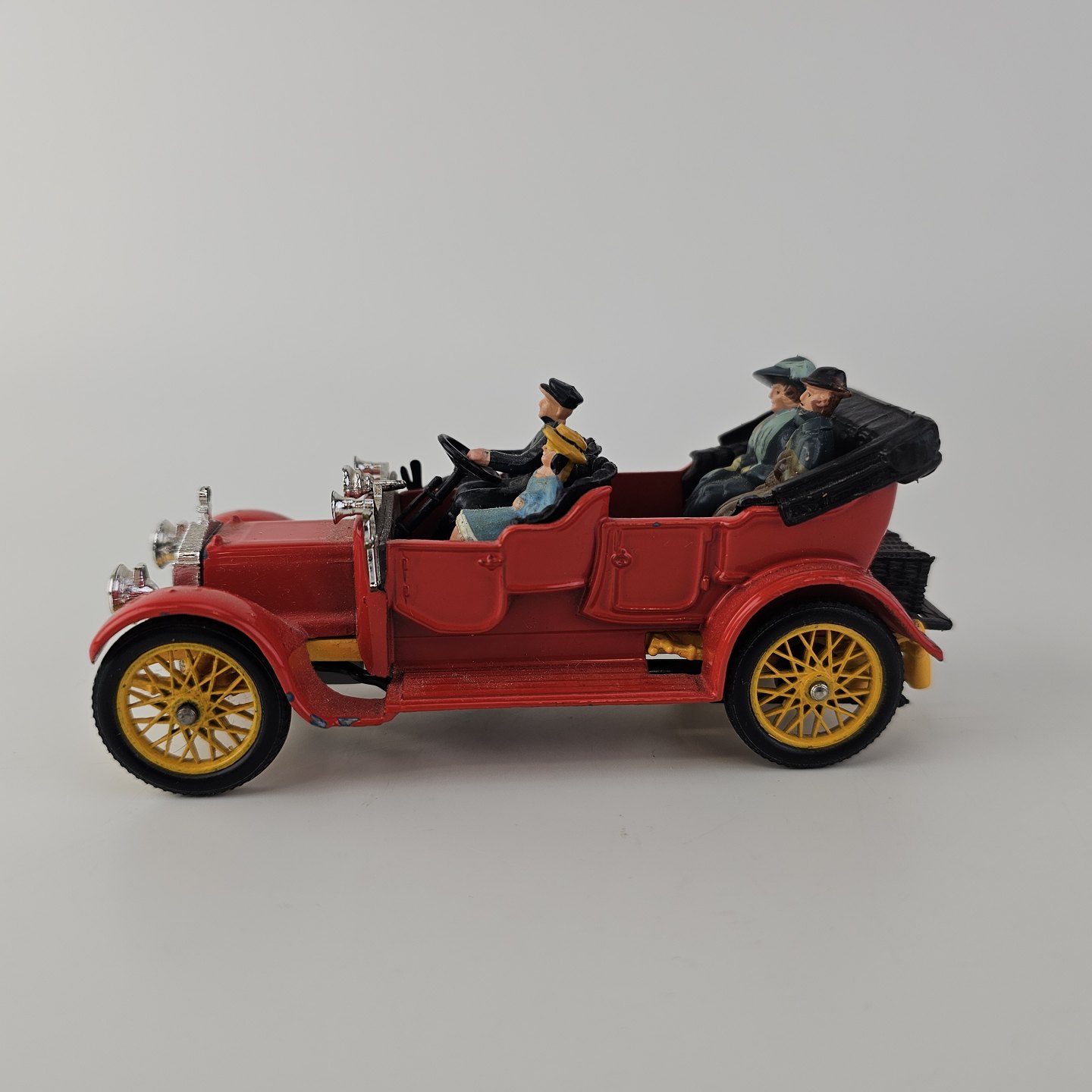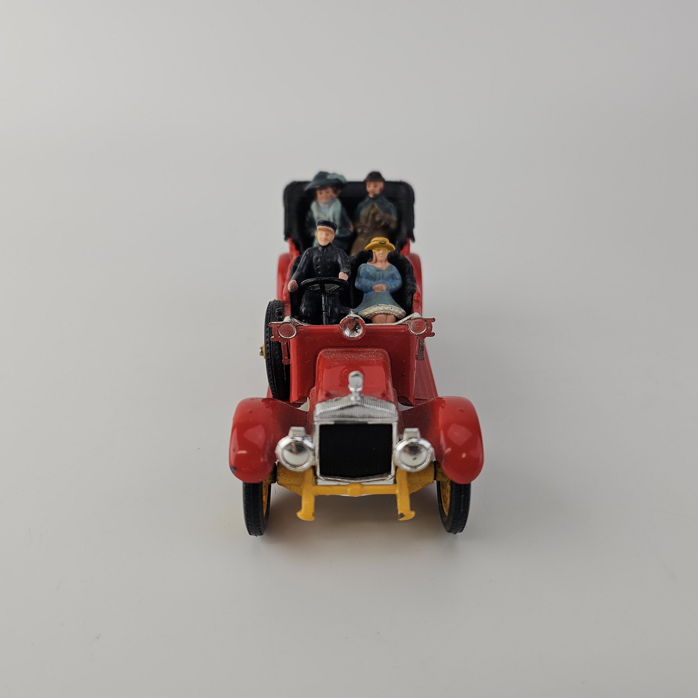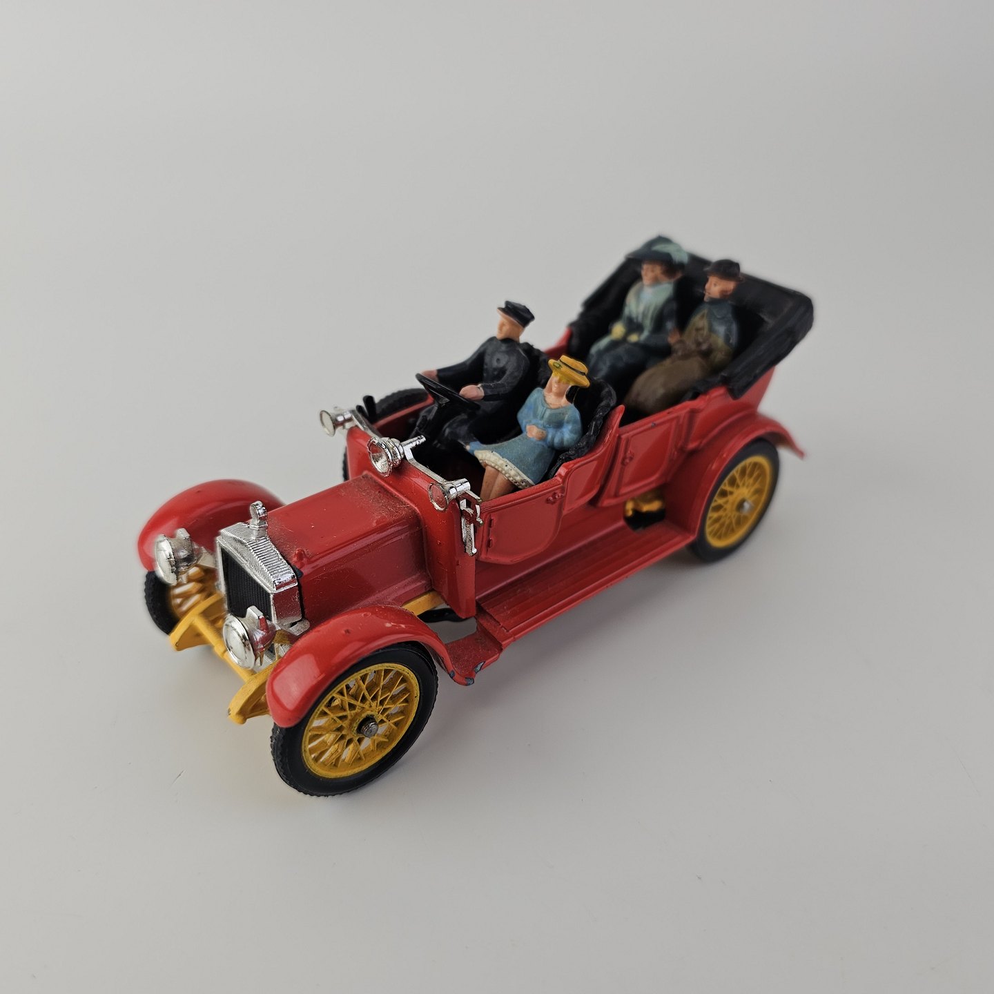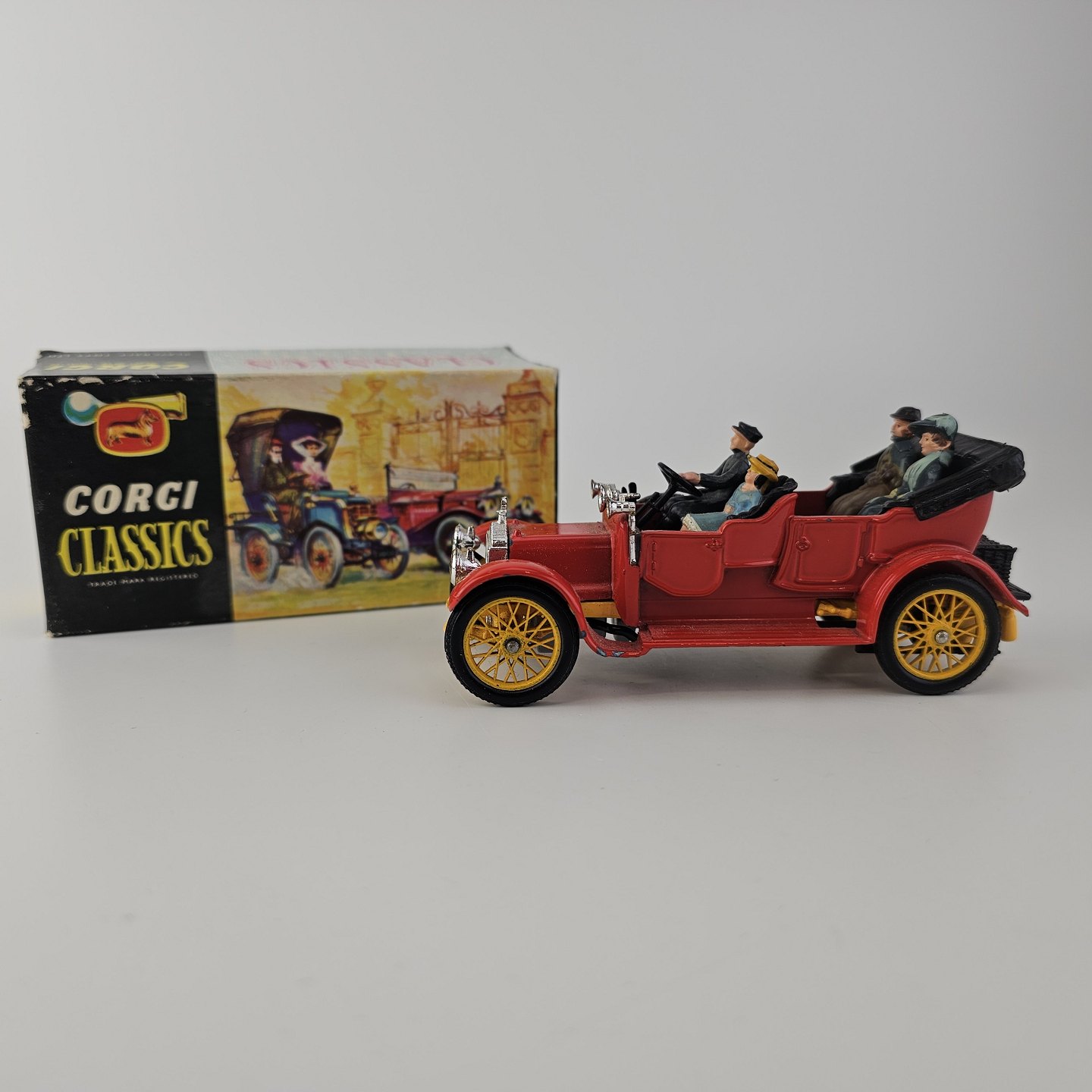 Corgi classics modelbil 1920 Daimler. Rød bil med gule hjul inklusiv fire passagerer, kommer i original kasse