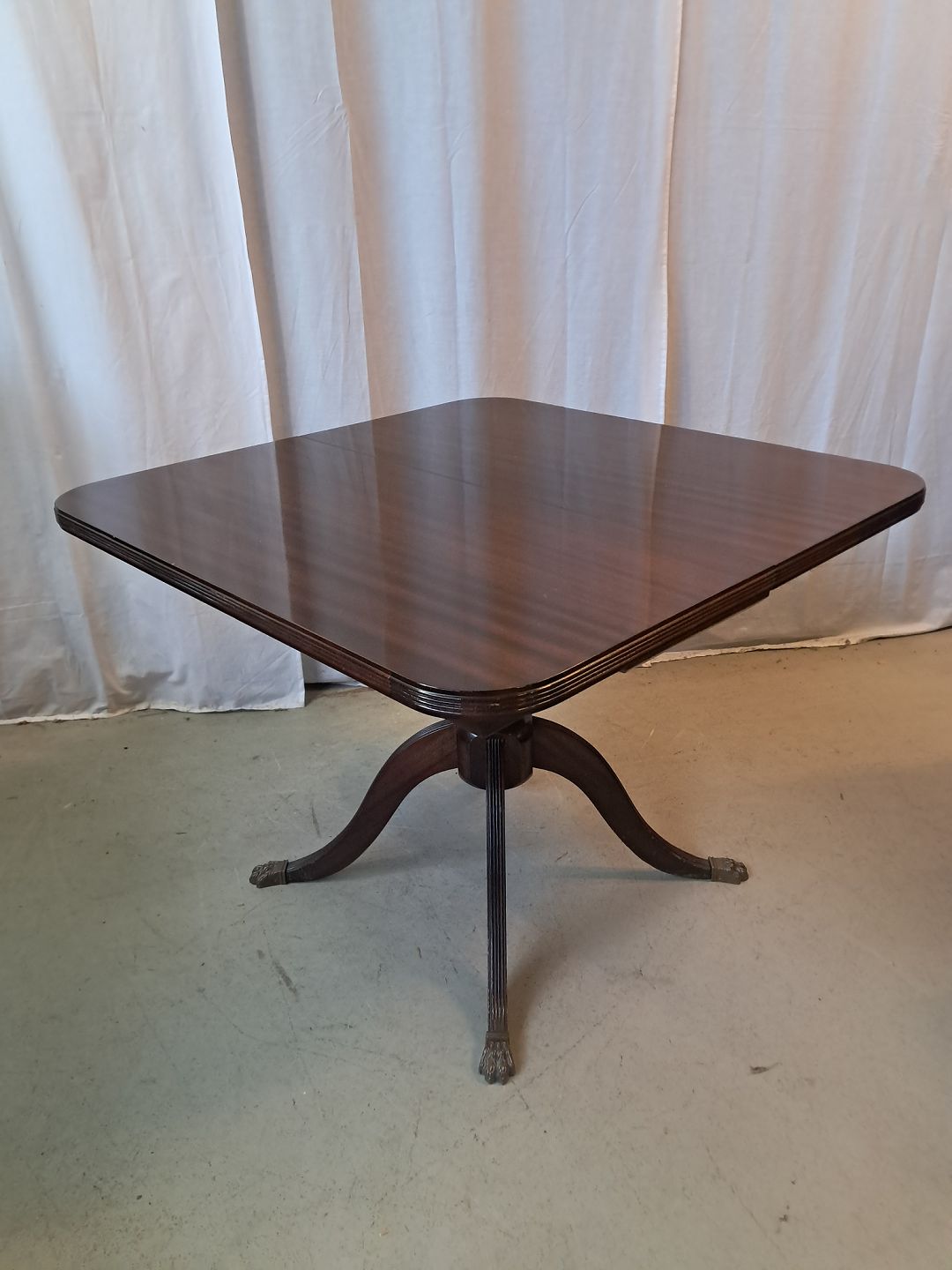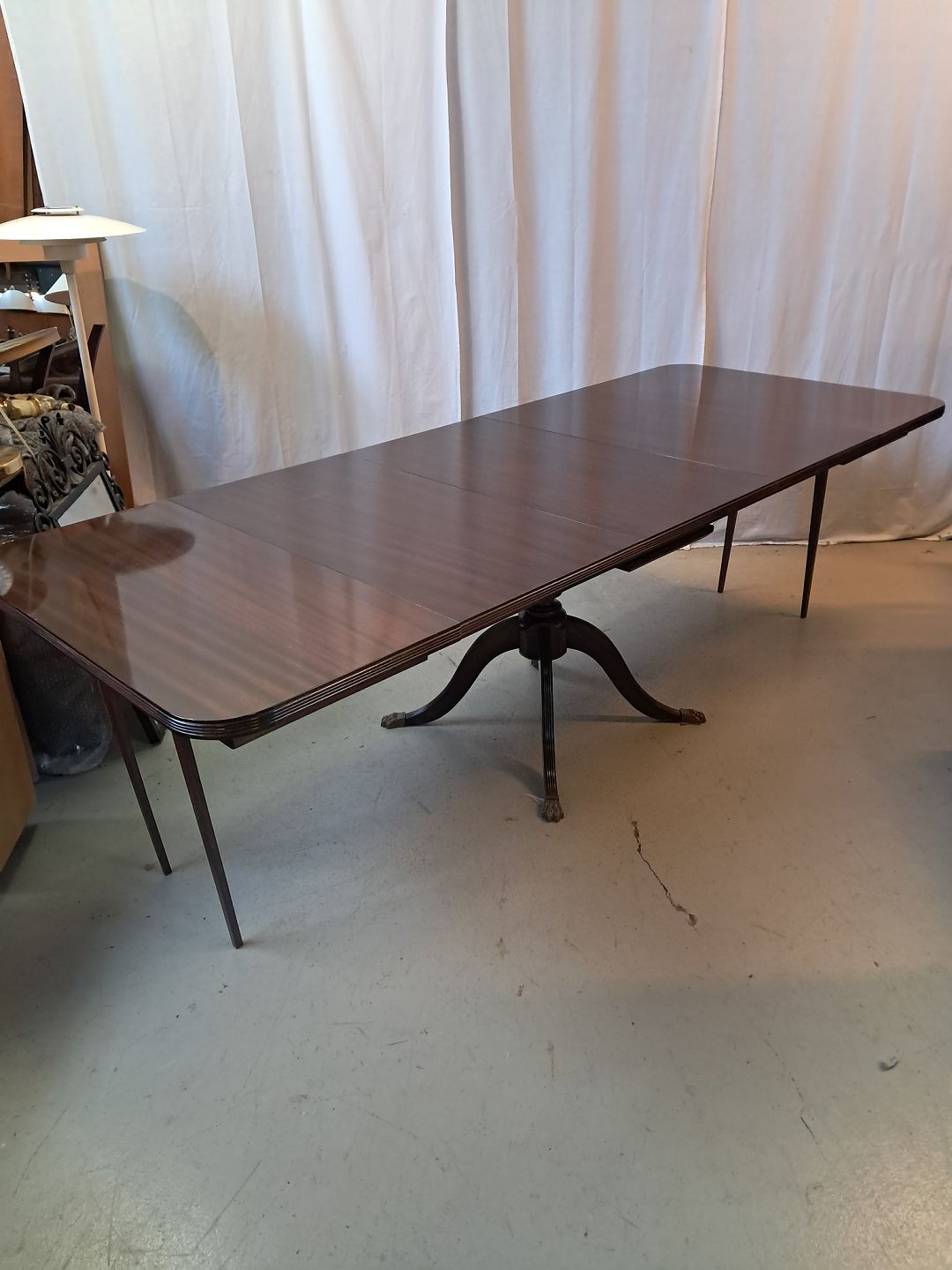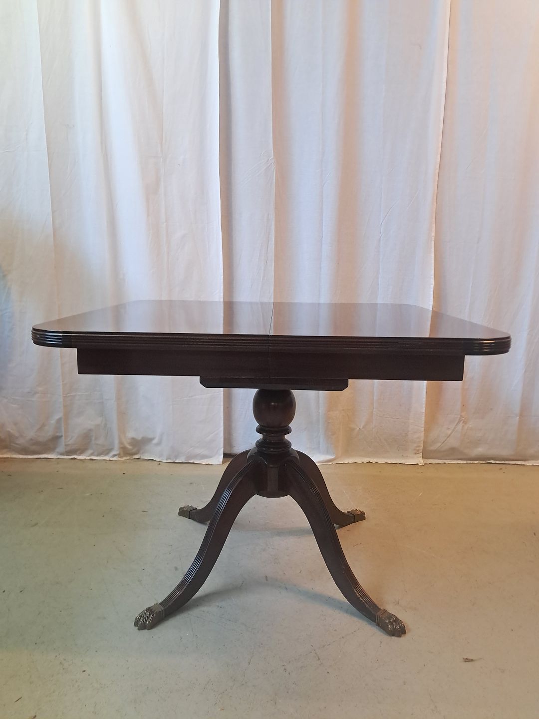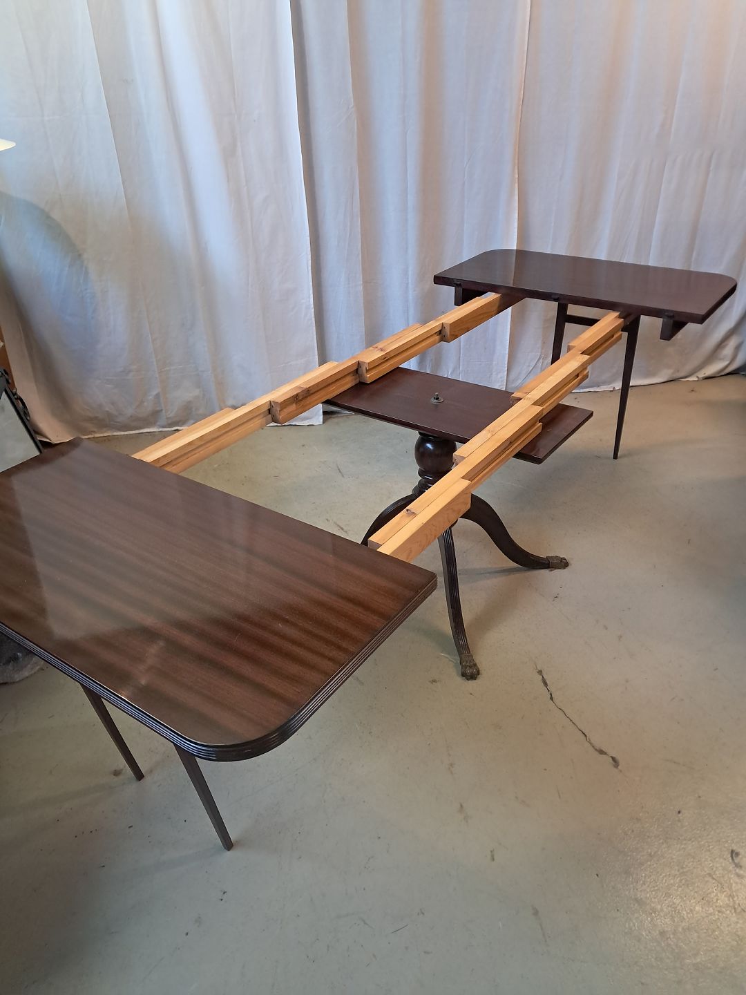 Spisebord i fineret mahogni med 3 tillægsplader, fra 1980erne.