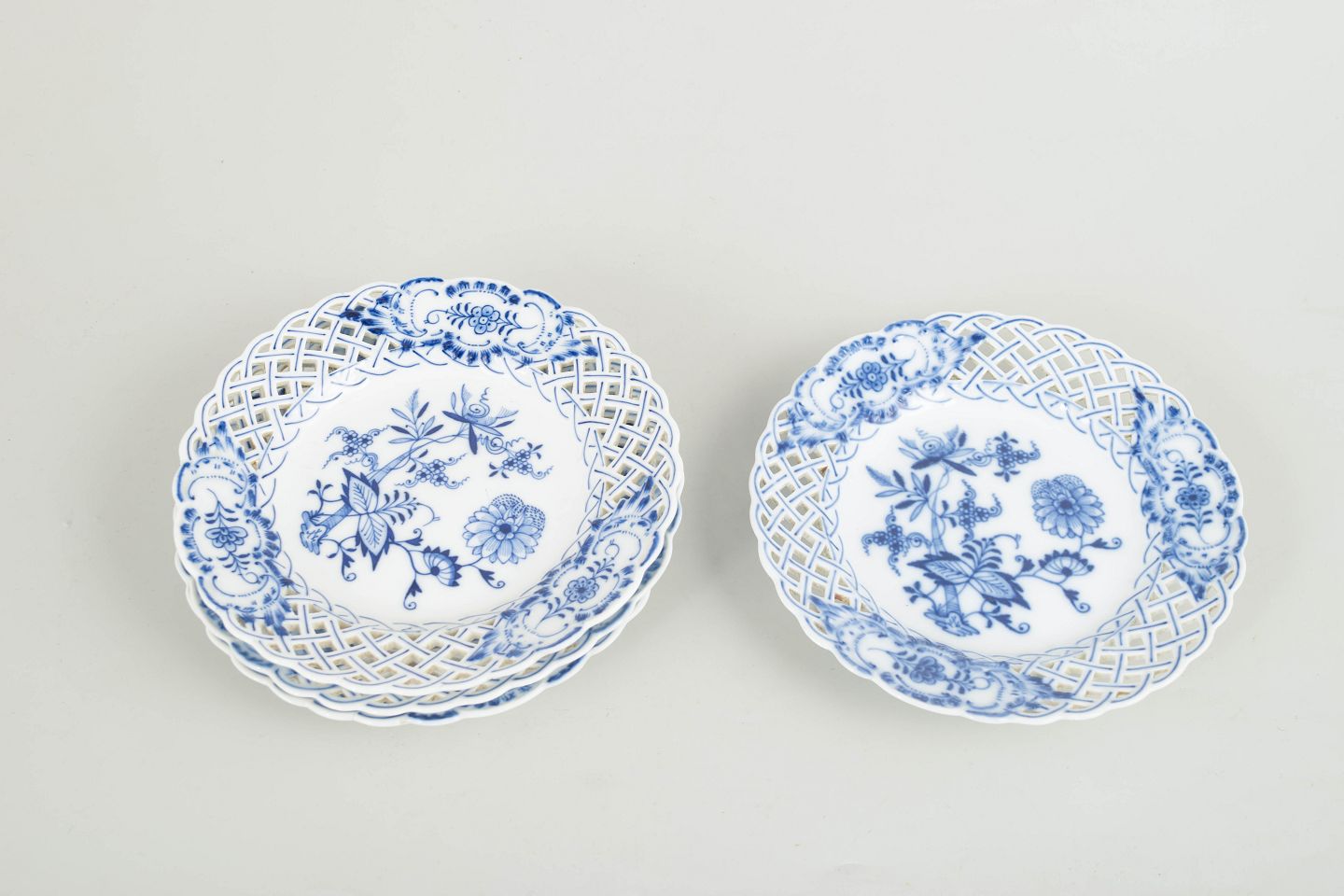 Small porcelain plates with pierced lattice rim and underglaze-blue decoration in the Blue Onion pattern.
