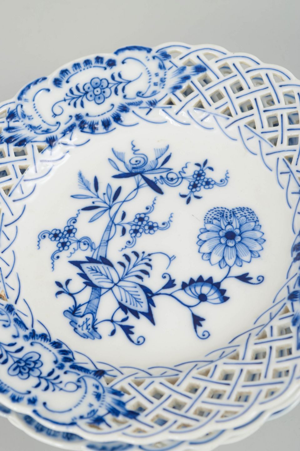 The Blue Onion pattern by Meissen is one of the most recognisable and widely produced designs in European porcelain history. Openwork plates with lattice rims were commonly used for cakes or desserts and combine technical skill with decorative lightness, framing the Chinese-inspired motif within an airy ornamental border.