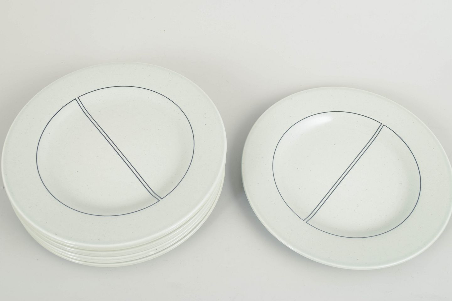 Flat faience plates with white glaze and graphic decoration featuring a black circle and diagonal line, produced in the “Demi” model.