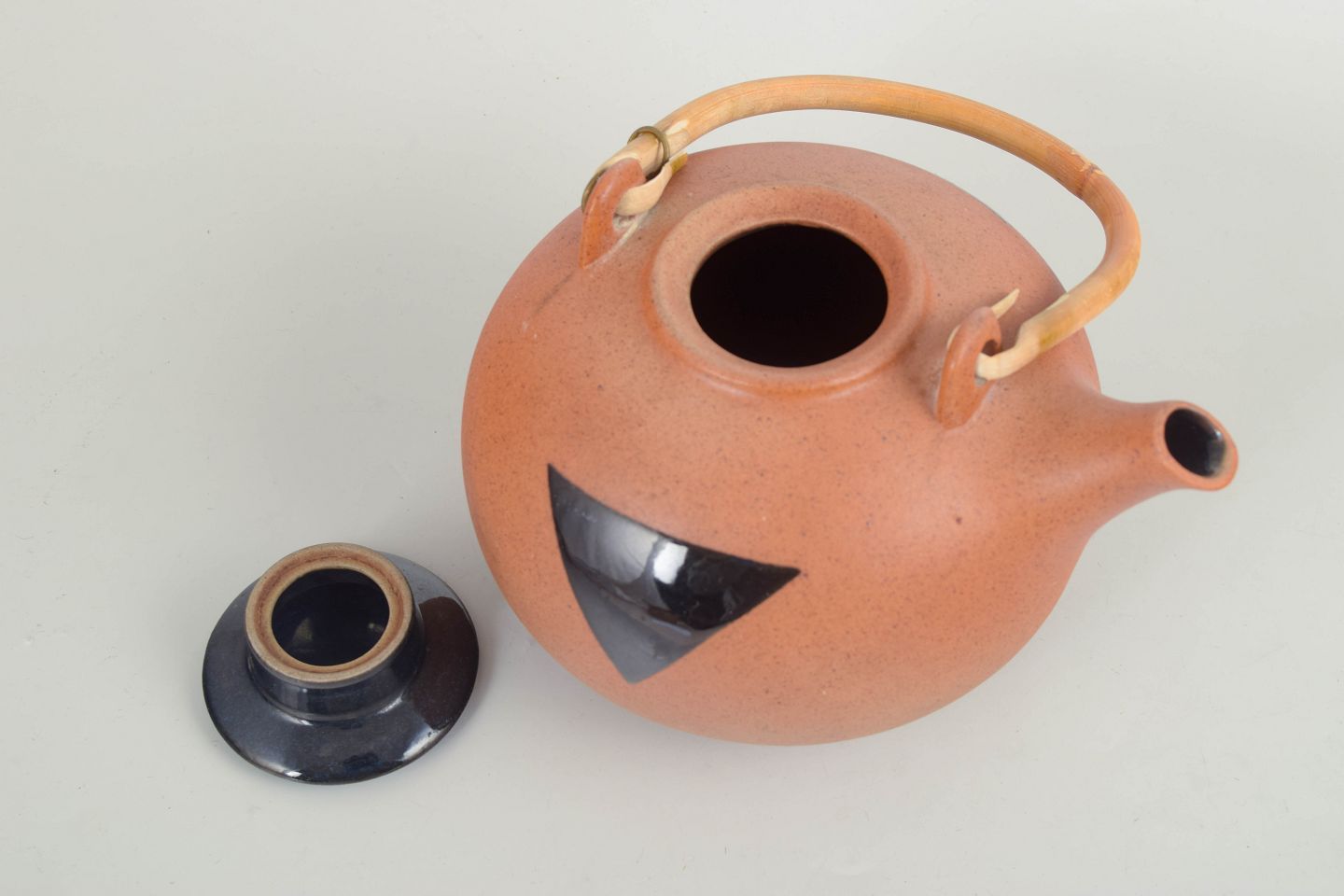 Rare stoneware teapot with a matte warm orange/sand-toned glaze and a bold black triangular motif on the body. Fitted with a black lid and a tall swing handle that gives the piece a distinctly sculptural profile. Model 332.