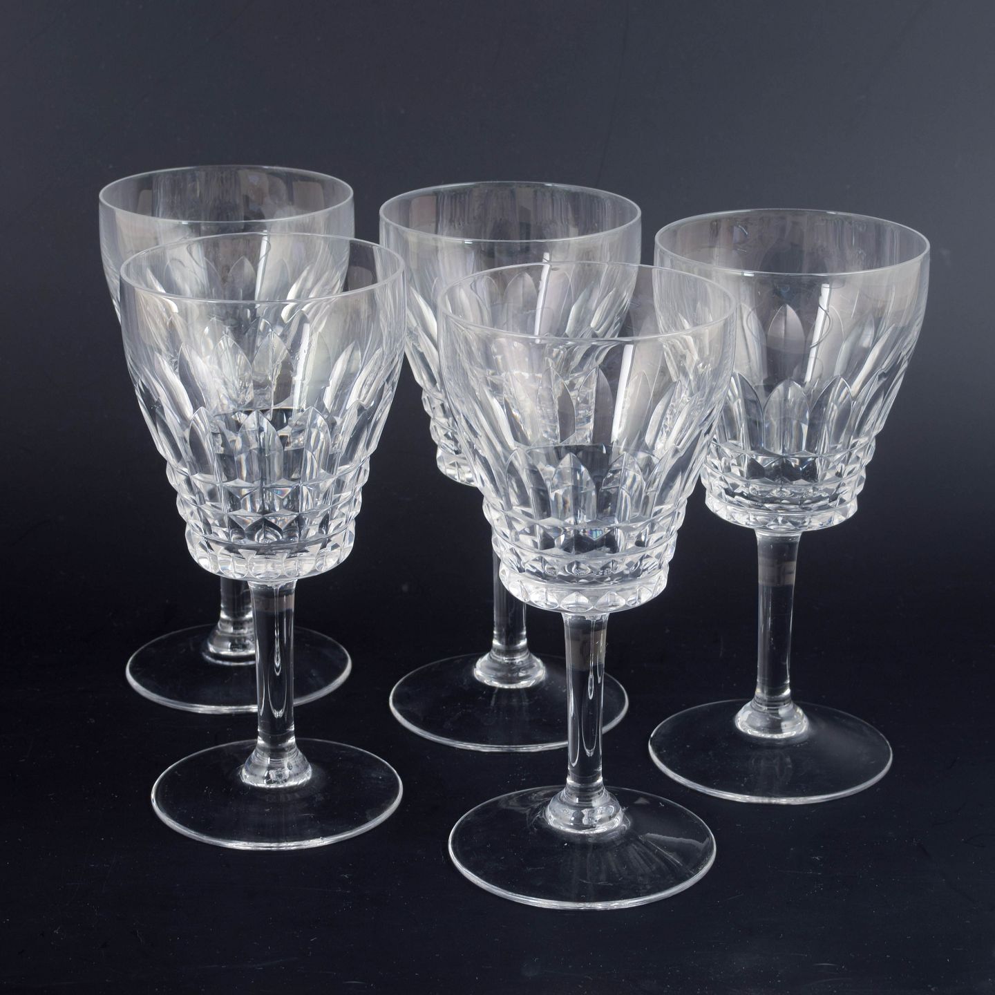 Set of five French red wine glasses in clear crystal, featuring a faceted bowl and a classic stem. The cut surfaces catch the light beautifully, giving a refined mid-20th-century look.