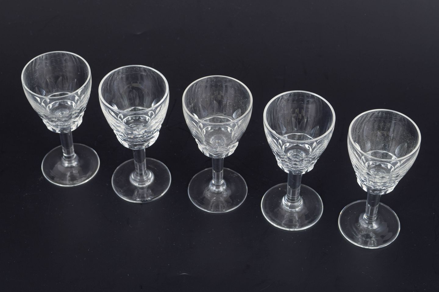 Set of five French schnapps glasses in clear crystal, featuring a faceted bowl and a classic stem. The cut surfaces catch the light beautifully, giving a refined mid-20th-century look.