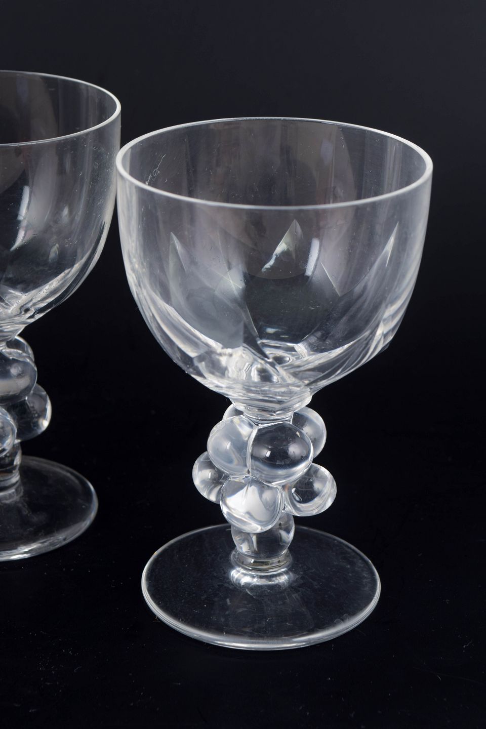 Set of four large and rare wine glasses in clear moulded glass with faceted bowls and stems formed as clusters of grapes. The “Clos Vougeot” model is characterised by refined Art Deco-inspired symmetry, where decorative elements also serve a sculptural and functional purpose. The glasses are signed to the base.