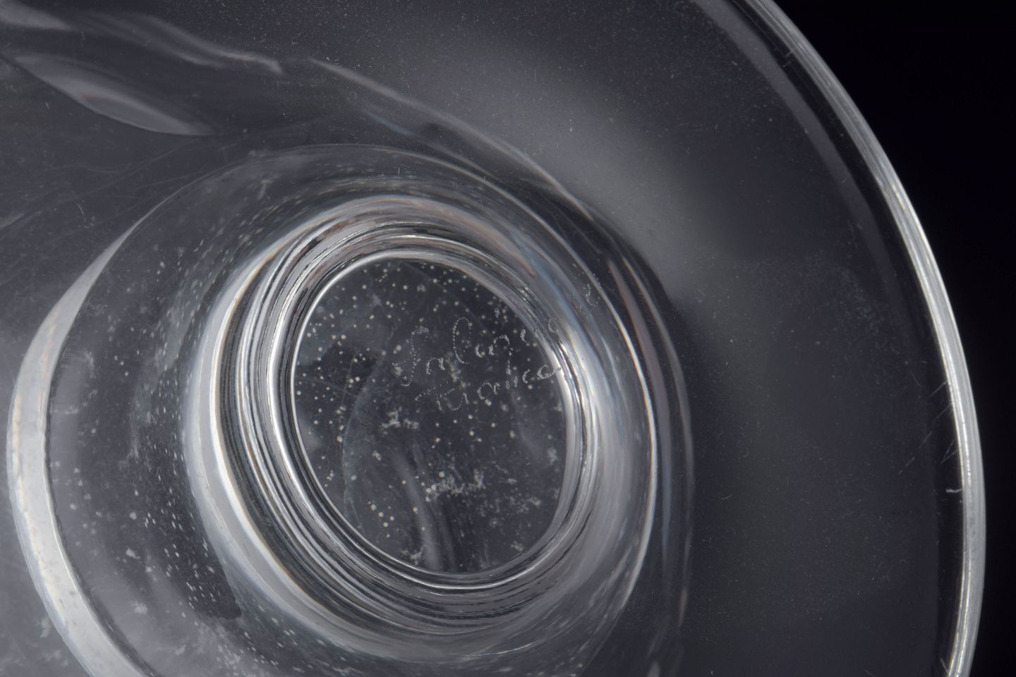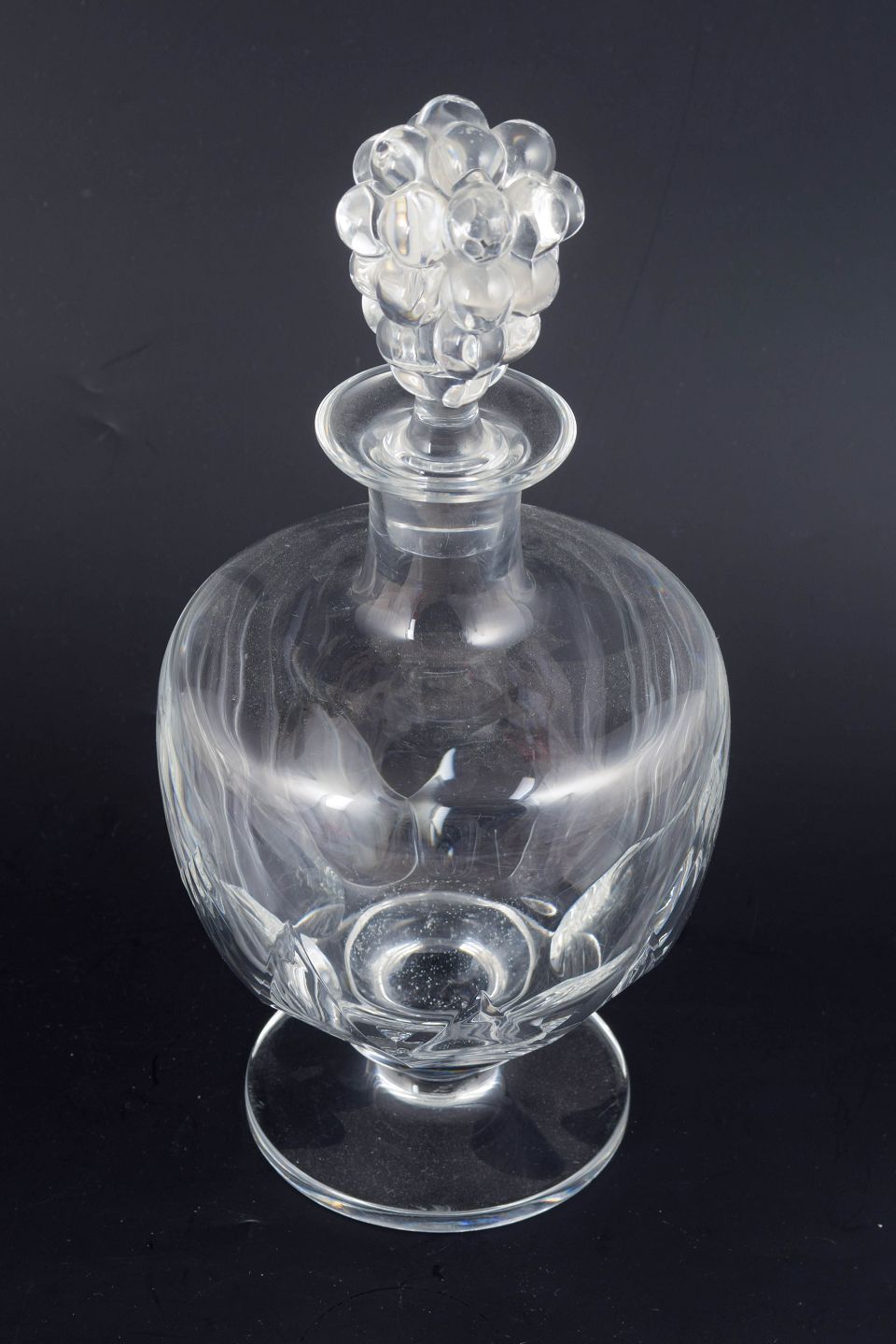 Large and rare wine decanter in clear moulded glass with relief-cut body and a stopper formed as a cluster of grapes. The “Clos Vougeot” model is characterised by Art Deco-inspired symmetry and faceted surfaces that catch and reflect the light, emphasising the purity of the glass. Signed to the base.