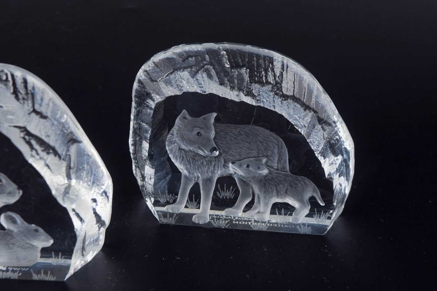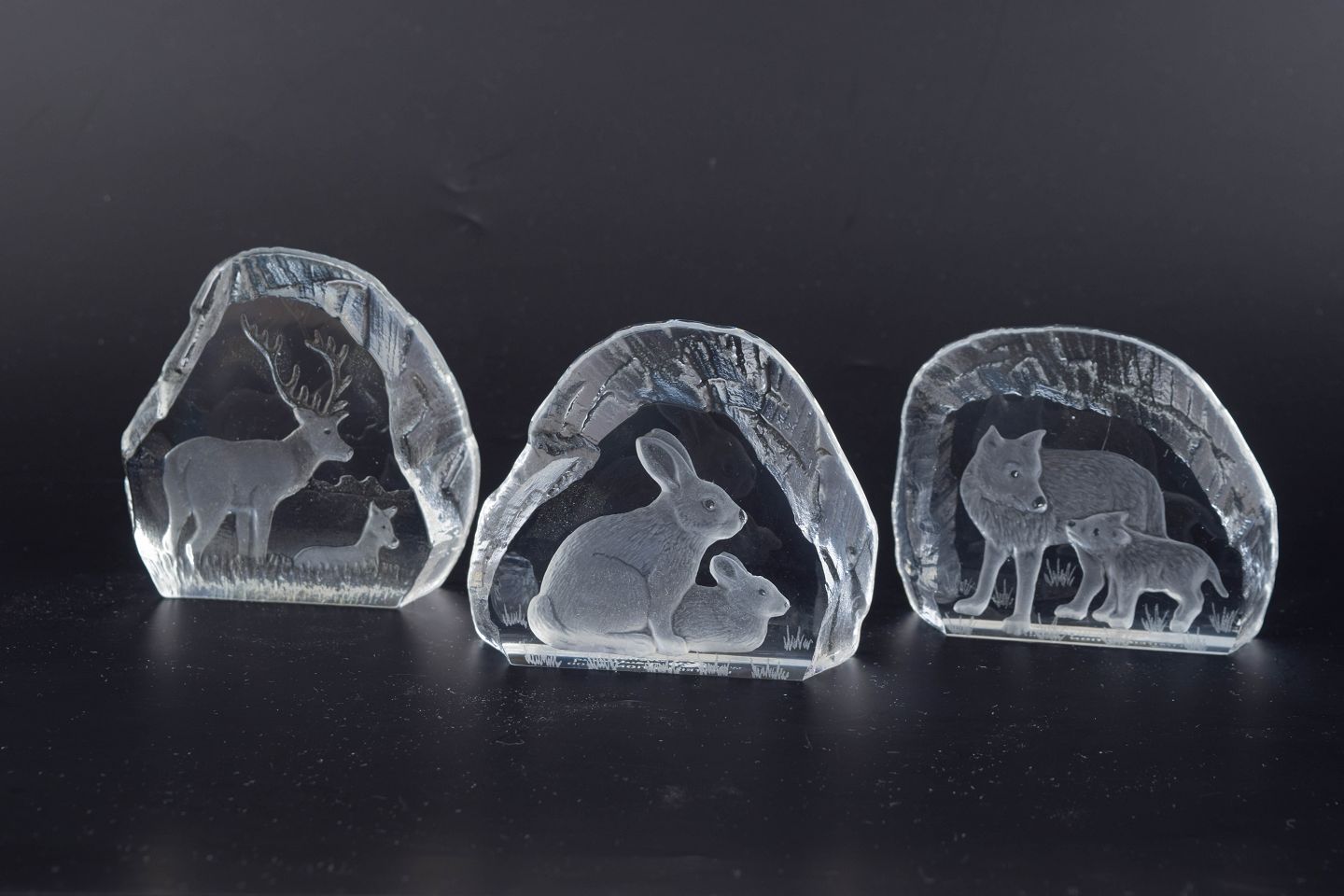 Sculptural glass figures with engraved animal motifs (moose, hare and wolf), executed in clear glass and issued as a limited edition in collaboration with WWF.