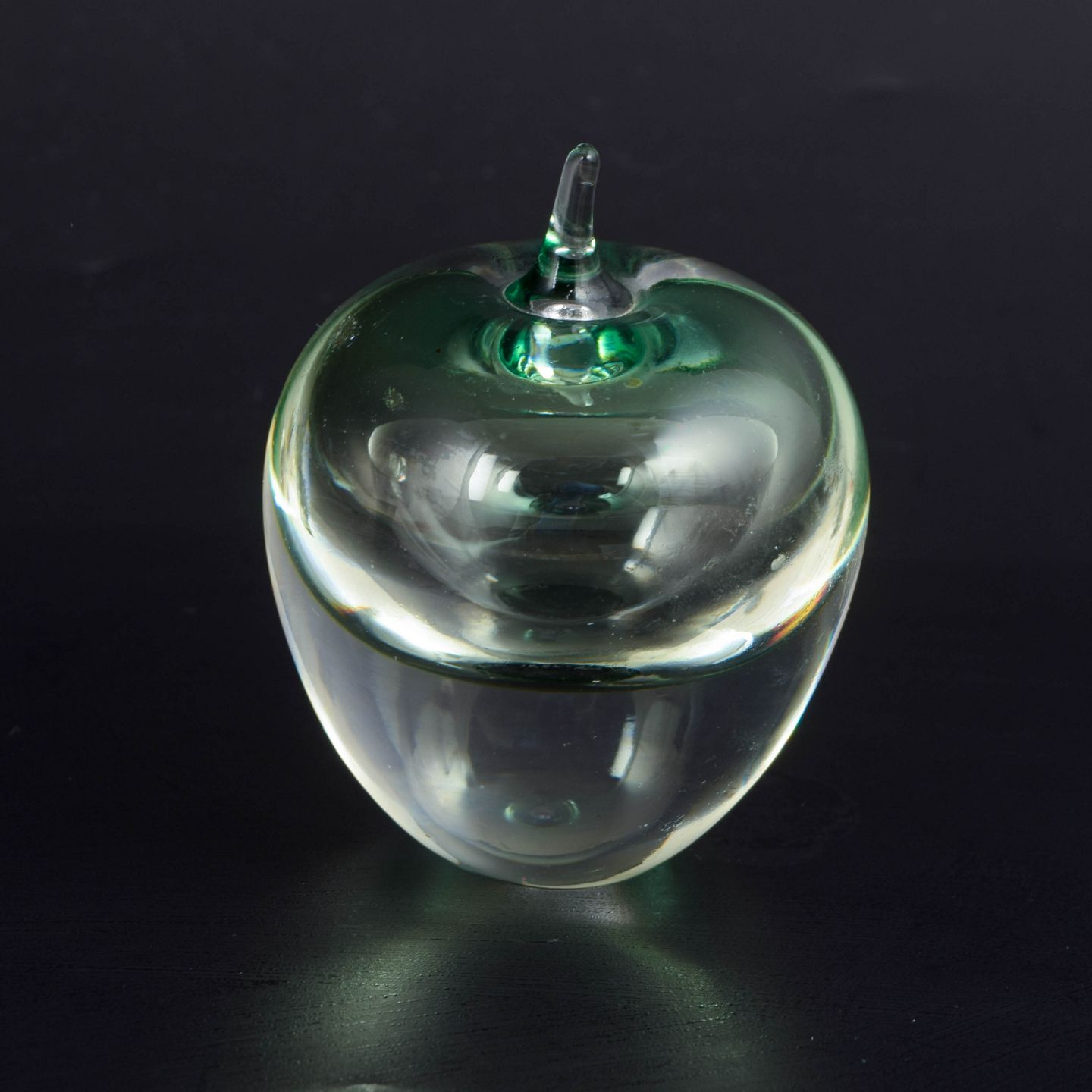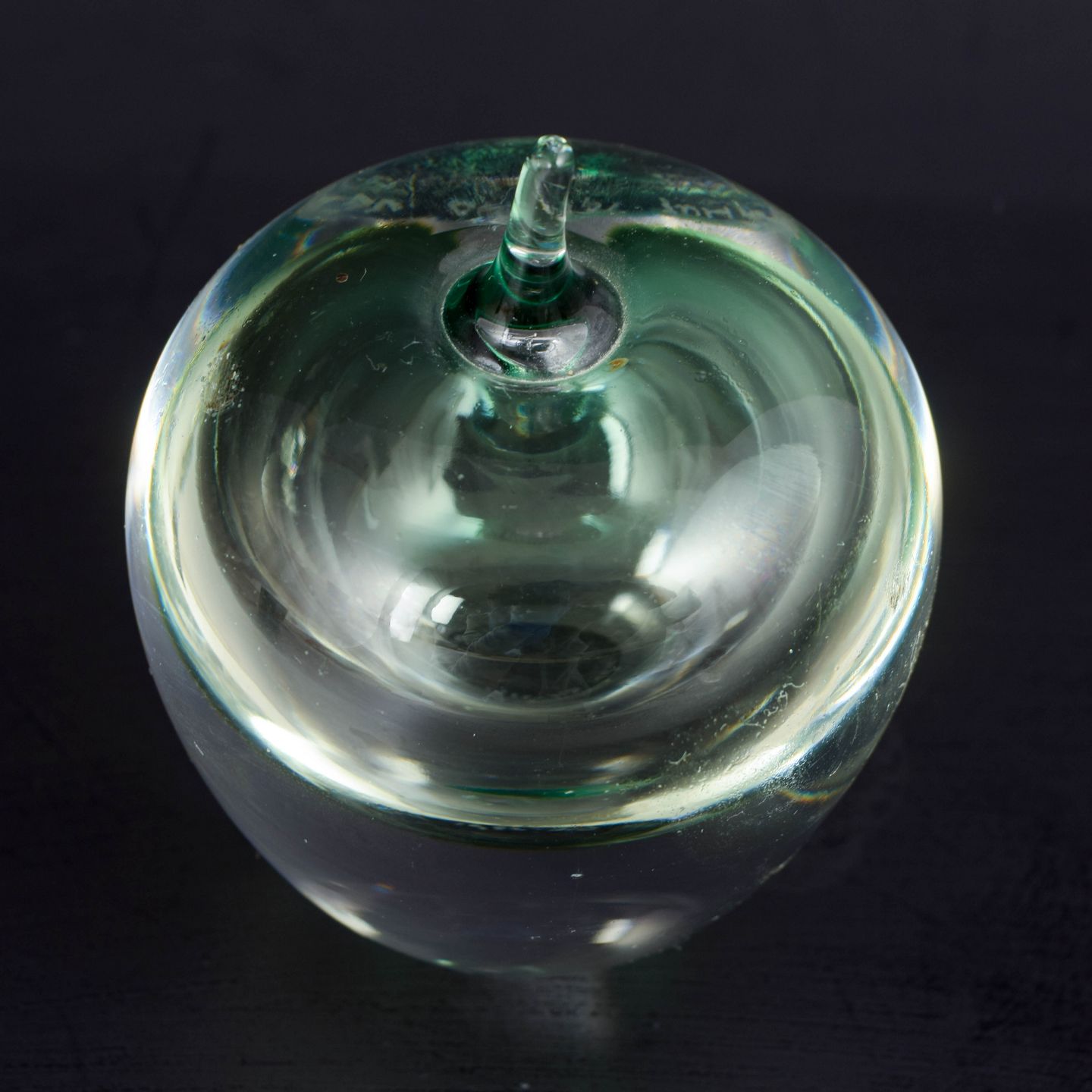 Sculptural clear-glass object with an encased green form and a central optical “lens” effect, made as mouth-blown studio glass with an emphasis on volume, refraction and a strong sense of depth.