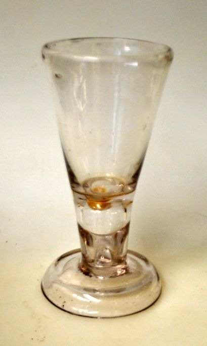 Masonic glass. Conradsminde, 1834 - 1857, Denmark. Clear glass with bent foot and hollow stem. Dia.: 5.6 cm. H.: 12.5 cm.
