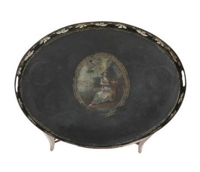Oval Regency tray table of mahogany, circa 1800, decorated with inlay in the shape of a conch shell, frame with drawer and blind drawer, sides with candle holders, provided with tray of black painted metal with motif in the shape of a seated woman. H. 75 cm. W. 50 cm. L. 65.5 cm.