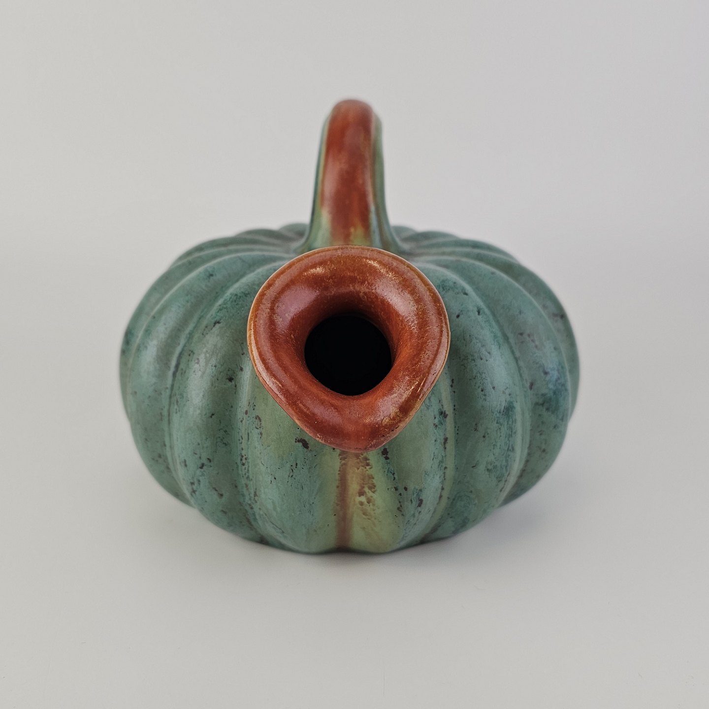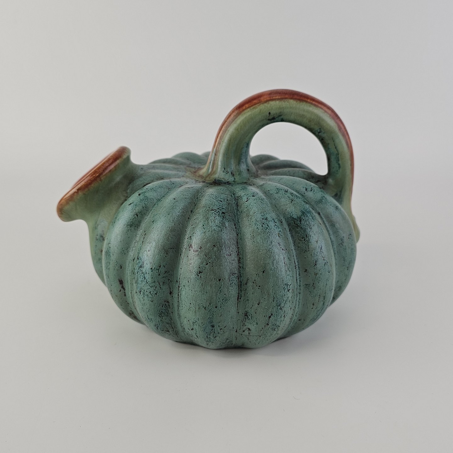 Kande i keramik med form som et græskar og grøn og brun glasering