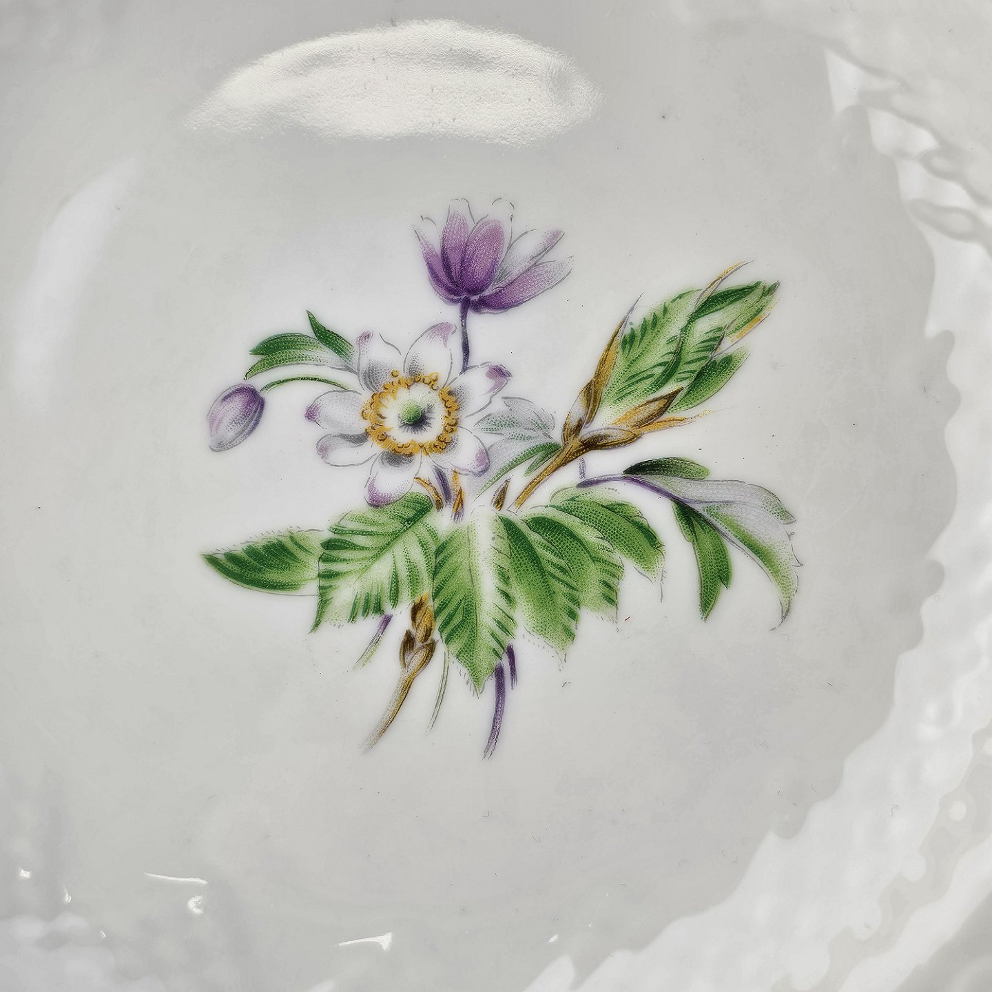 Frigga Anemone er cremefarvet porcelæn dekoreret med motiv af anemoner og bøgeløv med guldkant