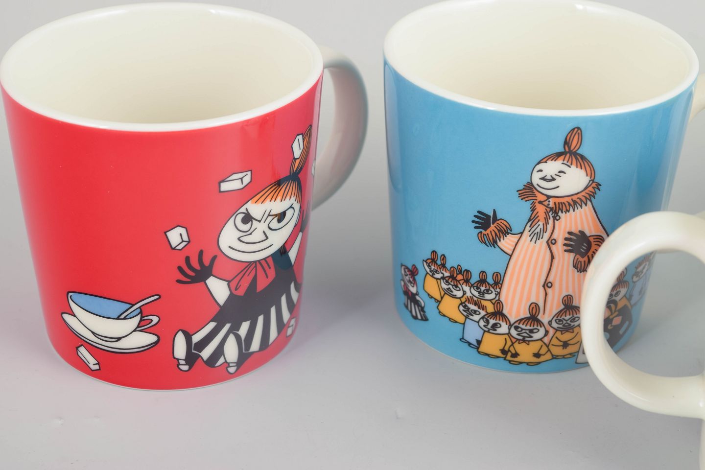 Porcelain mugs decorated with colourful illustrations from the Moomin universe.